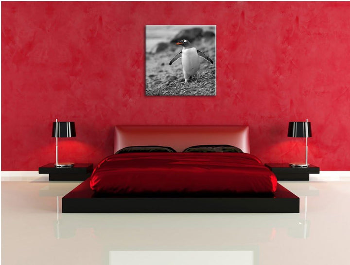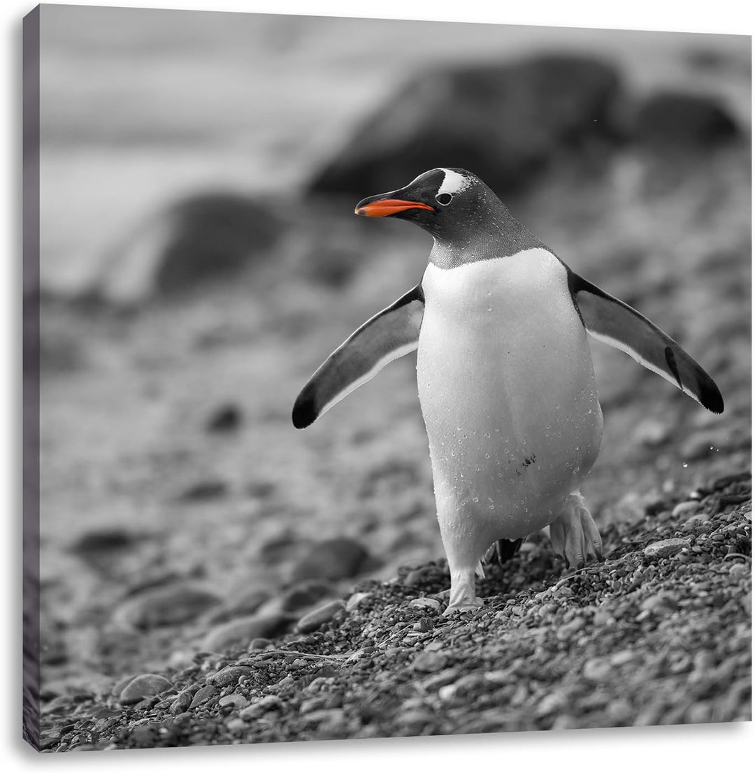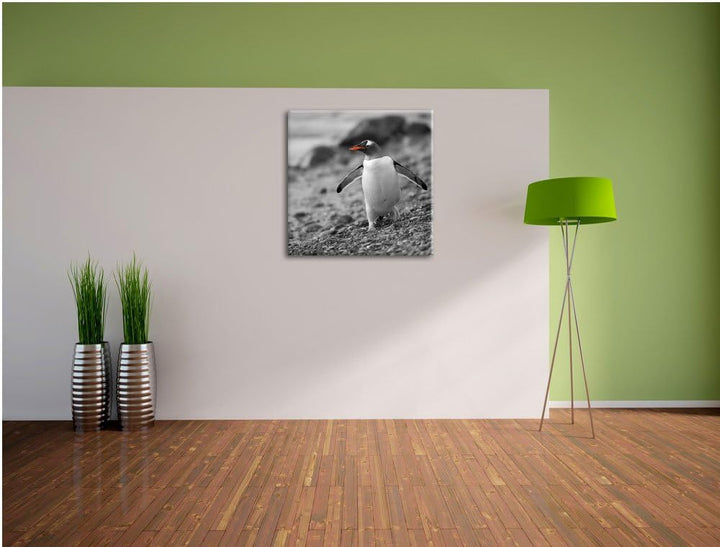 süsser Pinguin am Steinstrand schwarz/weiss, Format: 70x70 auf Leinwand, 70x70