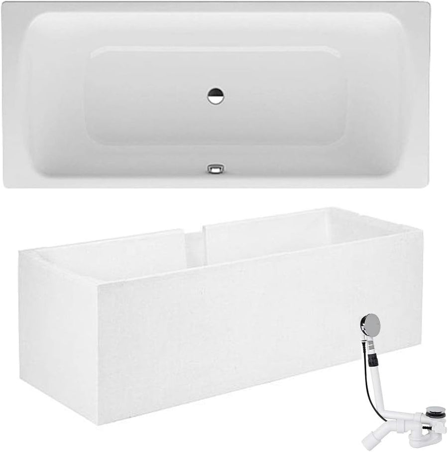 Stahl Badewanne Elunos 1800 x 450 x 800 weiss Wannenträger Ab- Überlaufgarnitur