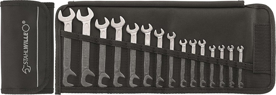 • Made in Germany - STAHLWILLE ELECTRIC Doppelmaulschlüssel Satz inrobusterRolltasche, 15-tlg., 3,2-14 mm, Chrome-Alloy-Steel, verchromt, 96400651