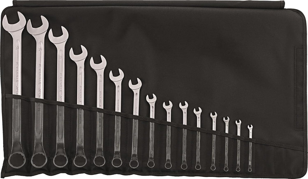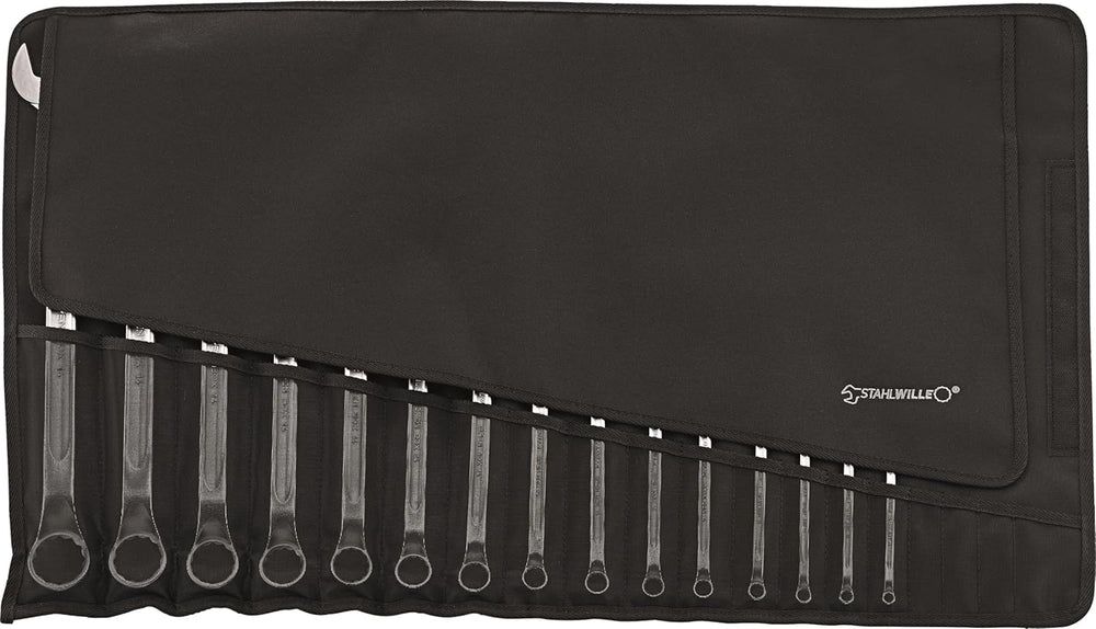- Made in Germany - STAHLWILLE Ringmaulschlüssel Satz inrobusterRolltasche, 15-tlg., 6-32 mm, lange Ausführung, Ringseite 10° abgewinkelt, DIN 3113 Form B, Chrome-Alloy-Steel, verchromt, 96401004