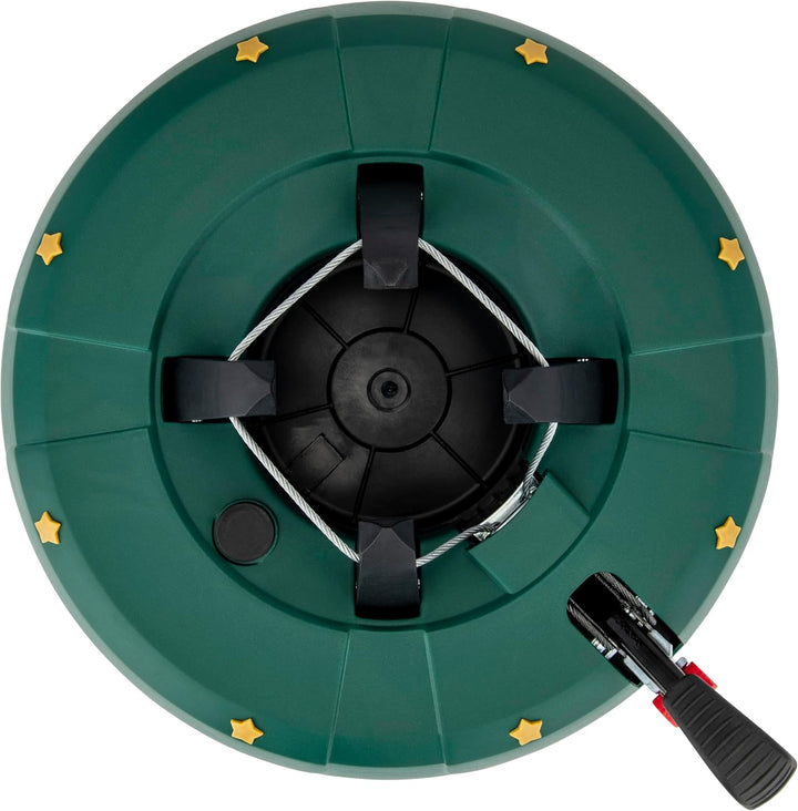 - Fusshebel-und Einseiltechnik, Vollkunststoffgehäuse, Wassertank, Wasserstandsanzeige, Öffnung zum Entleeren der Christbaumständer,
