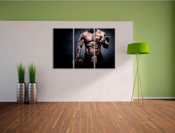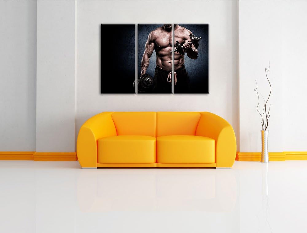 Starker Bodybuilder mit Hantel als 3-Teiler Leinwandbild 120x80 Bild auf Leinwand, XXL riesige Bilde