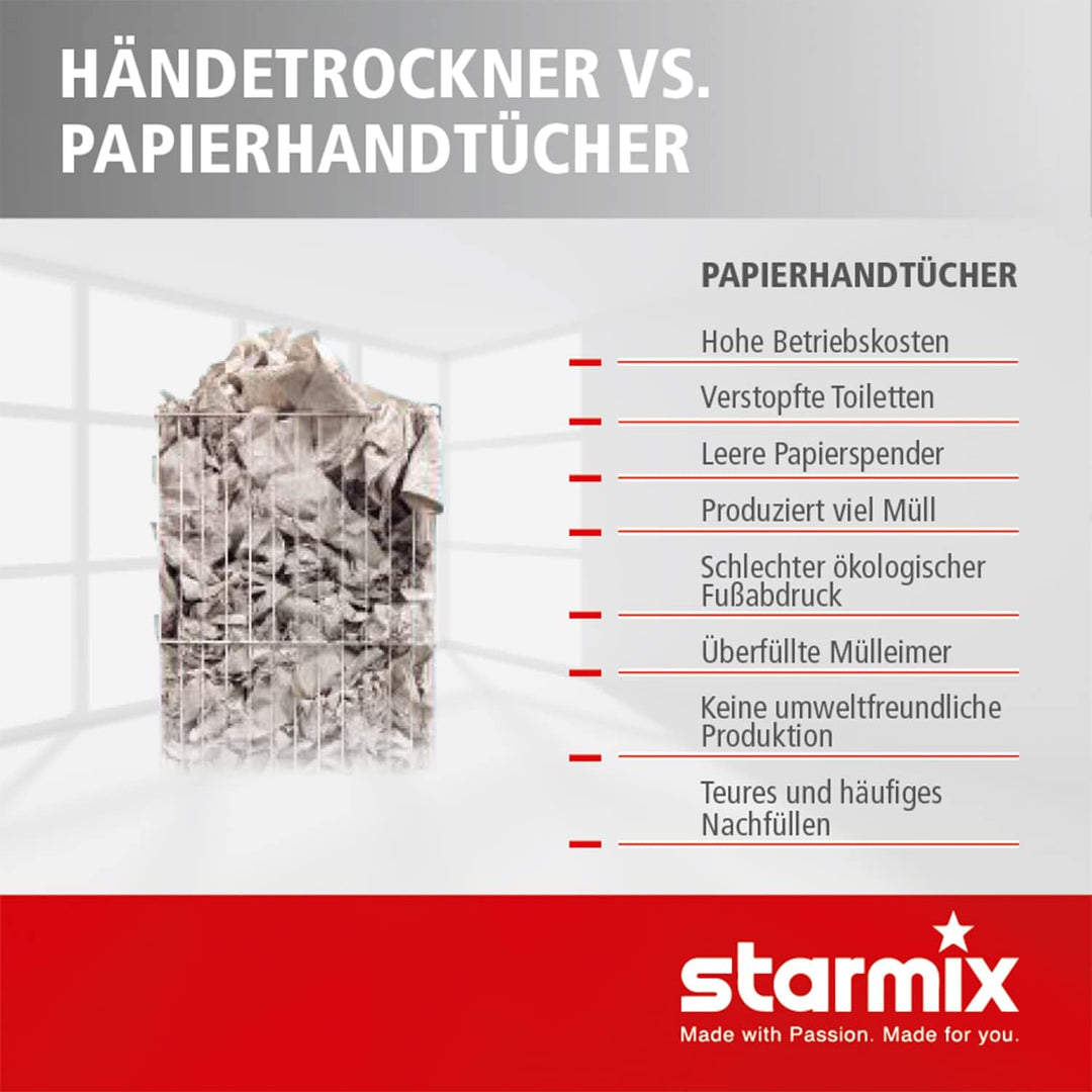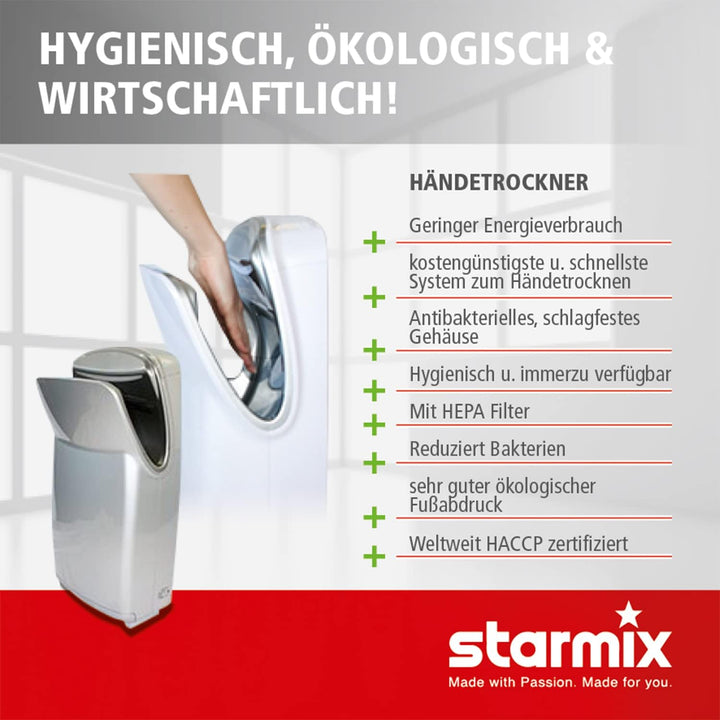 - STARMIX – DER ERFINDER DER WARMLUFTHÄNDETROCKNUNG: Bereits 1925 hat Starmix den Warmluft-Händetrockner erfunden und ist damit Pionier auf diesem Gebiet sowie einer der bedeutendsten Hersteller weltweit. „Made with Passion. Made for you.“