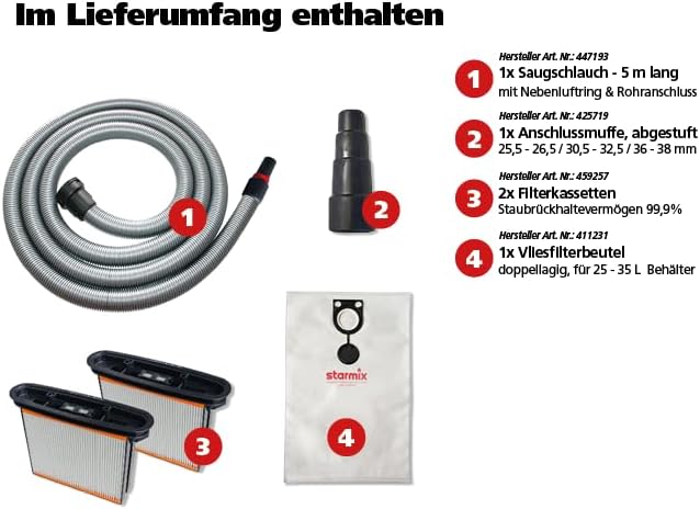 - BEWÄHRTE TECHNIK UND QUALITÄT: Geeignet zum Absaugen direkt am Elektrowerkzeug bei Bohr-, Fräs-, Schleif- und Sägearbeiten, Beton, Gips, Stein, Zement, Holz, Farben, Lacke (nicht gesundheitsgefährdende Stäube, Staubklasse "L").
