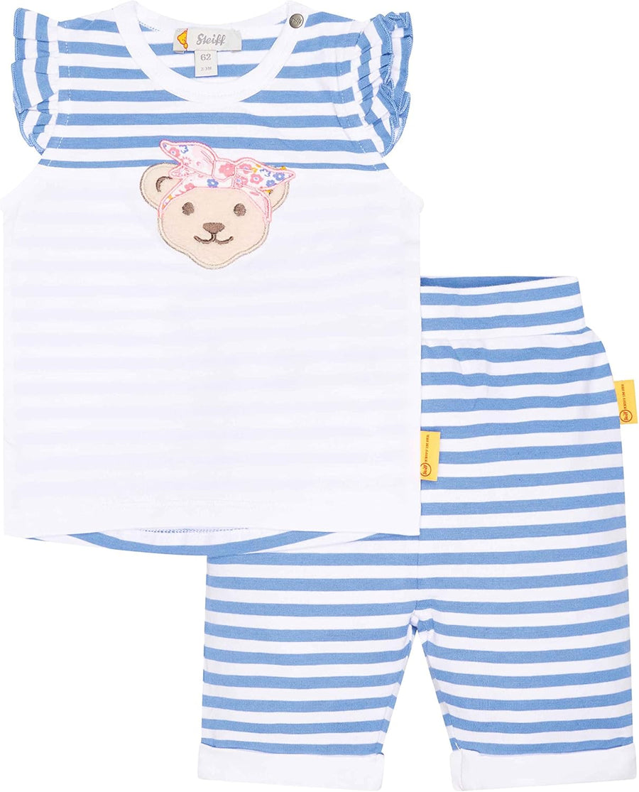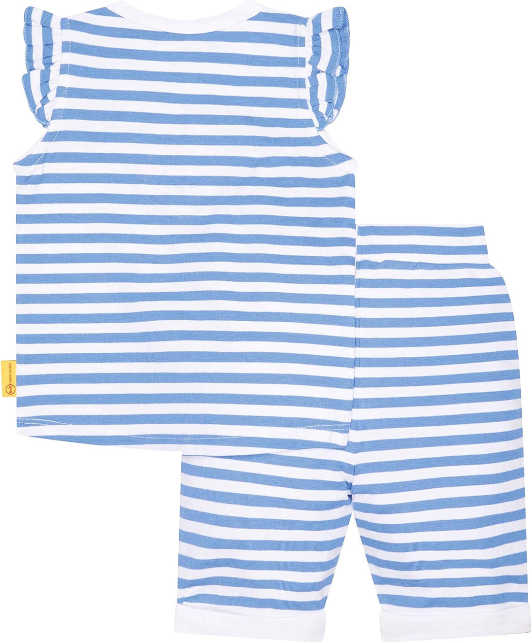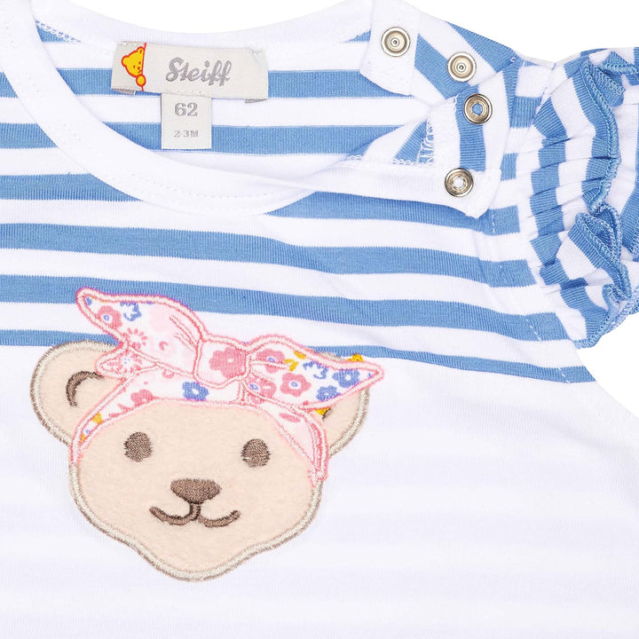 PRODUKTBESCHREIBUNGEN Perfekt gestylt gehen die kleinsten Ausflüglerinnen mit diesem 2er-Set aus T-Shirt und Leggings zum Weltentdecken. Locker geschnitten und mit verlängertem Rückenteil, bietet das Oberteil aktiven Mädchen viel Bewegungsfreiheit beim Spielen und Chillen. Druckknöpfchen auf der Schulter helfen beim Anziehen. Tunnelzug und krempelbare Beinabschlüsse machen die Hose zu einem echten Lieblingsstück. Flügelärmelchen und Streifen wahlweise in Lachsrosa oder Ultramarin verbinden Romantik mit Retro-Chic. Auch das flauschige Steiff Teddybärmotiv hat sich schick gemacht. Auf ins Vergnügen!