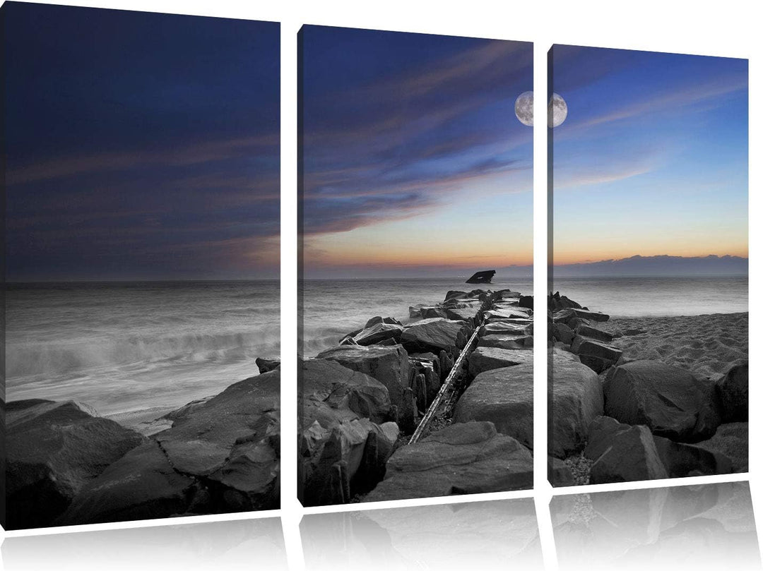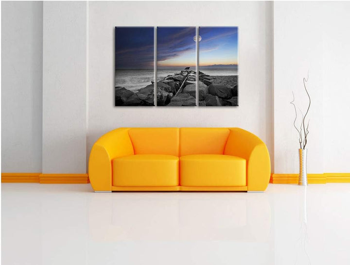 Steinmauer am Meer bei schönem Abendhimmel schwarz/weiss 3-Teiler Leinwandbild 120x80 Bild auf Leinw