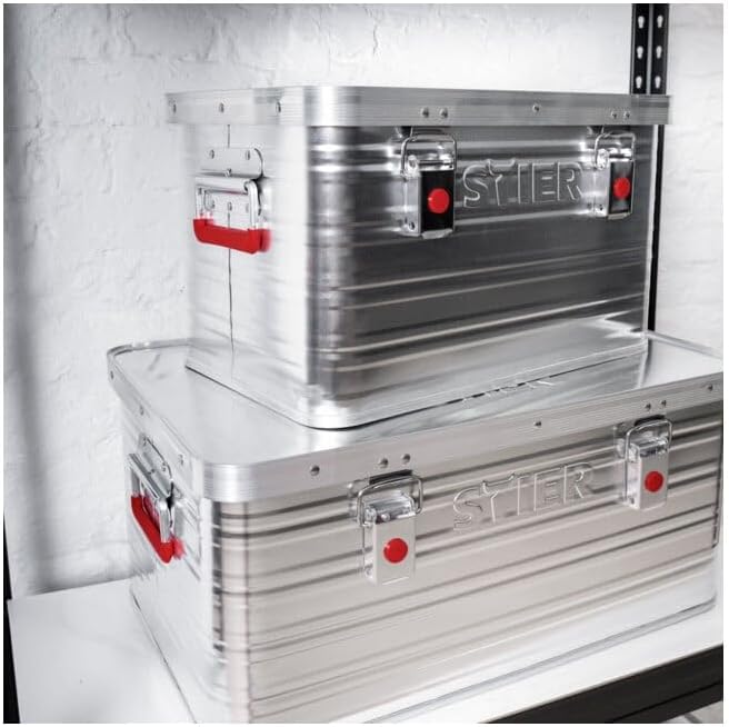 - SICHERER EINSATZ: Stabile Hebelspannverschlüsse für wirksames Haften des Deckels; Begrenzungen im Deckelrahmen für einfaches Stapeln mehrere STIER Aluboxern; Seitlich angebrachte Hebelgriffe für bequemen Transport
