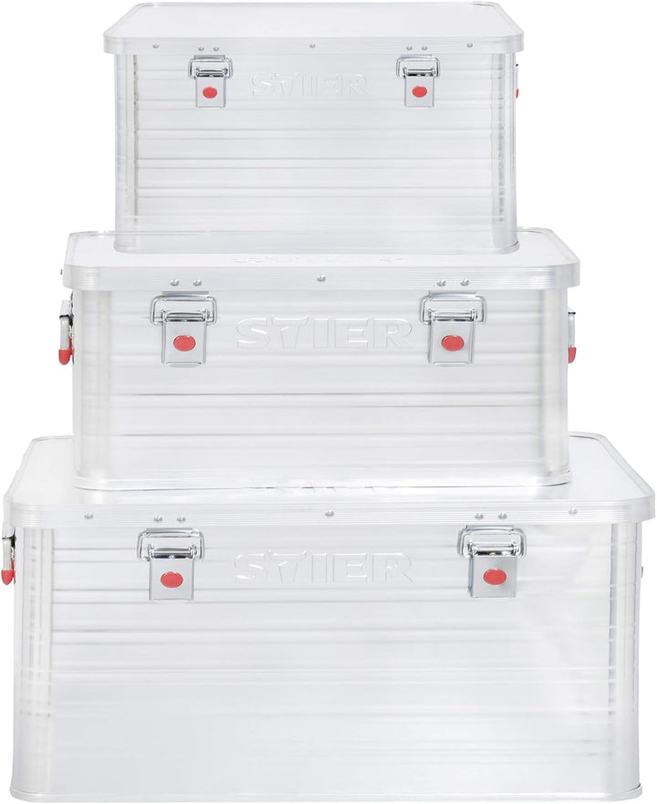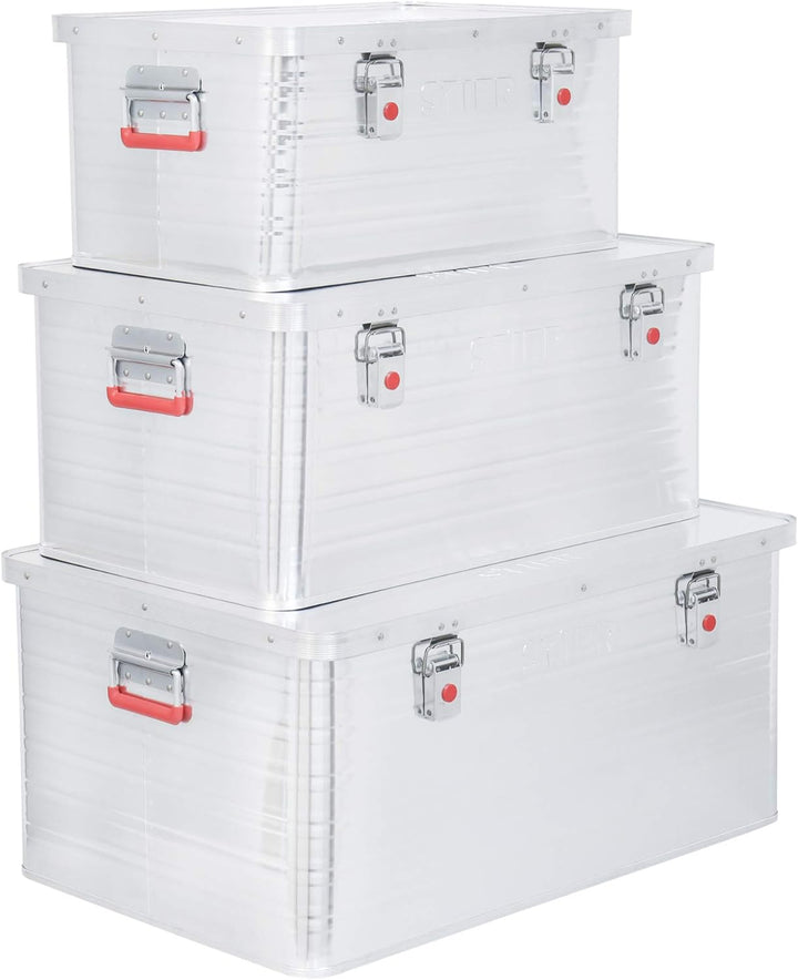 - STABILE VERARBEITUNG: Hochwertiges Aluminium und stabile Verarbeitung für einfaches Handling, optimale Lösung zum Aufbewahren, Lagern und Transportieren. Das STIER Alubox Set beinhaltet jeweils eine Alubox mit 50L / 85L / 135L Fassungsvermögen