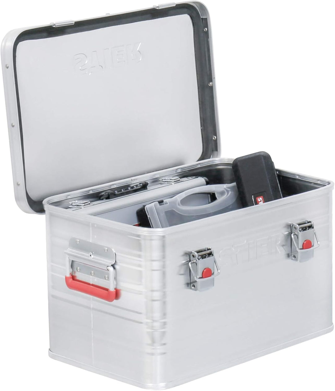 - SICHERER EINSATZ: Stabile Hebelspannverschlüsse für wirksames Haften des Deckels; Begrenzungen im Deckelrahmen für einfaches Stapeln mehrere STIER Aluboxern; Seitlich angebrachte Hebelgriffe für bequemen Transport