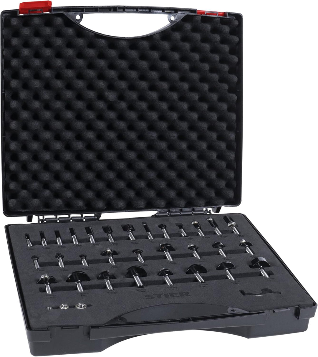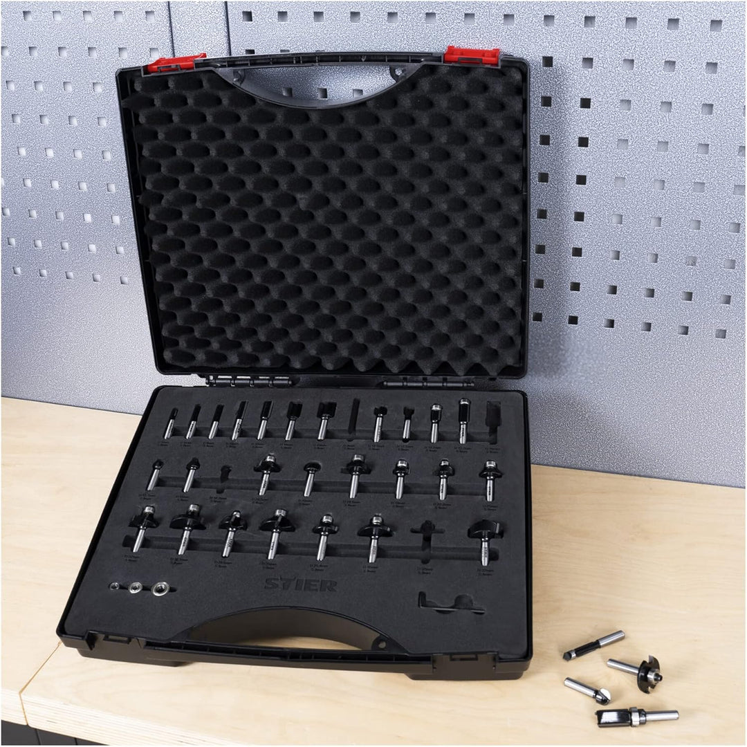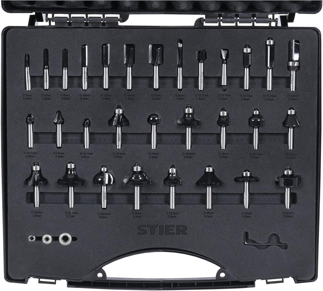 - VIELSEITIG: Das STIER Oberfräse Fräser Set ist in vielen Anwendungsgebieten einsetzbar und ist der ideale Begleiter bei Holzarbeiten jeglicher Art. Kompatibel mit allen gängigen Oberfräsen und einem 8mm Bohrfutter. In dem Koffer sind die Fräser gut