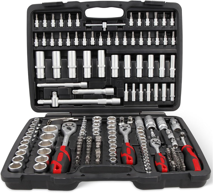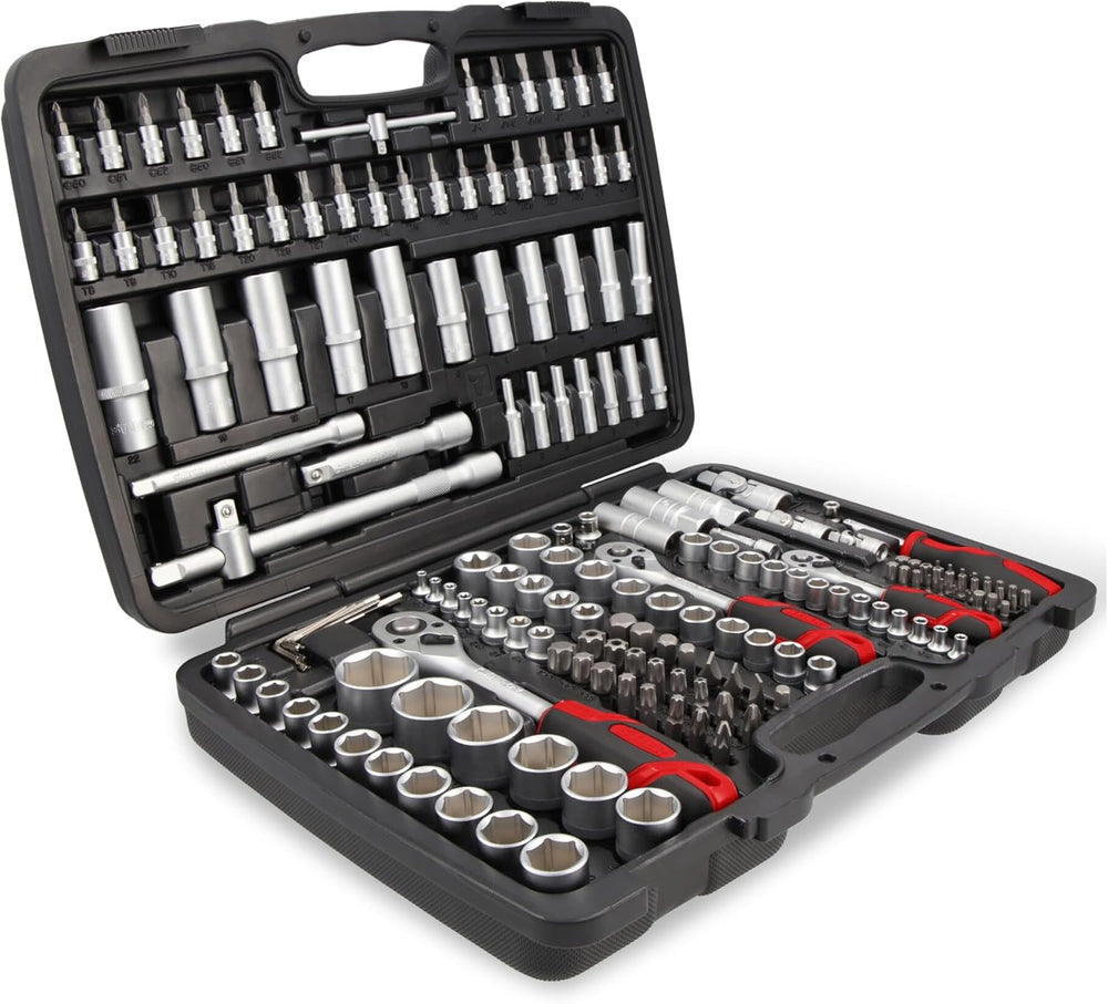 - IM KOFFER: Komplettes Set mit Umschaltknarren, Einsätzen und Ratschen. Zusätzlich sorgen zahlreiche Verlängerungen und Adapter dafür, dass sich auch Arbeiten an schwer zugänglichen Stellen verrichten lassen.