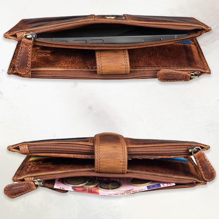 - Masse im geschlossenen Zustand: ca. 10,5 x 3 x 20 cm I Gewicht: 210 Gramm I Material: Echtes Rindsleder I Modell: Handyportemonnaie 'Alyssa' | Natürliches Vintage Leder mit Kratzern und Farbabweichungen
