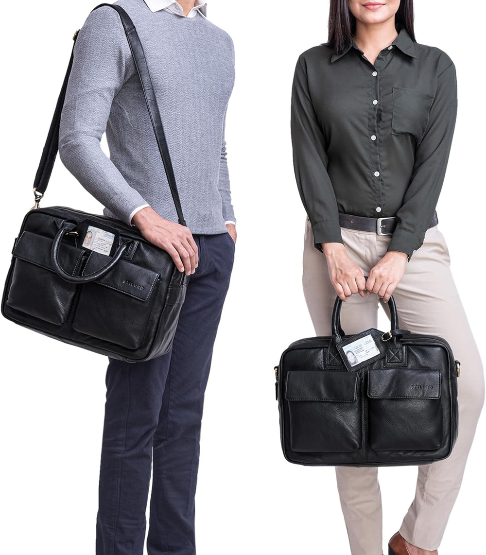 PRODUKTBESCHREIBUNGEN STILORD Grosse Umhängetasche Leder Lehrertasche Eine multifunktionelle, grosse und gleichzeitig elegante Ledertasche von STILORD. Beliebt ist die Tasche auch bei Lehrern, da das grosse Platzangebot eine strukturierte Aufbewahrung der Arbeitsmaterialien ermöglicht. In Beruf, Freizeit oder auch auf Reisen haben Sie dieser besonderen Umhängetasche viele Vorteile: Den Anfang macht der praktische Schultergurt, der längenverstellbar und abnehmbar ist. Alternativ tragen Sie das Lederunikat auch als Handtasche. Besonders praktisch ist das grosse, gepolsterte Laptopfach (40x22 cm) für MacBooks oder Notebooks (13 14 oder 15.6 Zoll). Hinzu kommt die praktische Organisationsleiste mit Stifthaltern, Portemonnaie bzw. Handy Fach und vier Kreditkartenhaltern. Alles Weitere in der Übersicht: Laptoptasche Leder Herren 15,6 Zoll - Highlights und Fakten - Tragemöglichkeit als Handtasche oder Umhängetasche - 1 x grosses Reissverschlussfach auf der Rückseite - 1 x längliches Fach mit Reissverschluss mit Einsteckfächern für Smartphone, Stifte und Kreditkarten - 1 x grosses Hauptfach, geeignet für Bücher oder grosse Aktenordner - Laptopfach für Geräte bis 15.6 Zoll - Masse ca. 40 x 22 cm | Polsterung & Klettverschluss zur Sicherung - jeweils 1 x Portemonnaie- und Schlüsselfach - elegantes Vintage Design - verstell- und abnehmbarer Schulterriemen (120 - 155 cm lang | 3,3 cm breit) - Abmessungen: 40 x 18 x 30 cm | Modell: Carlo | Material: echtes Büffel Leder | Hersteller: STILORD | Kompatibilität: Für 15,6 Zoll Laptops