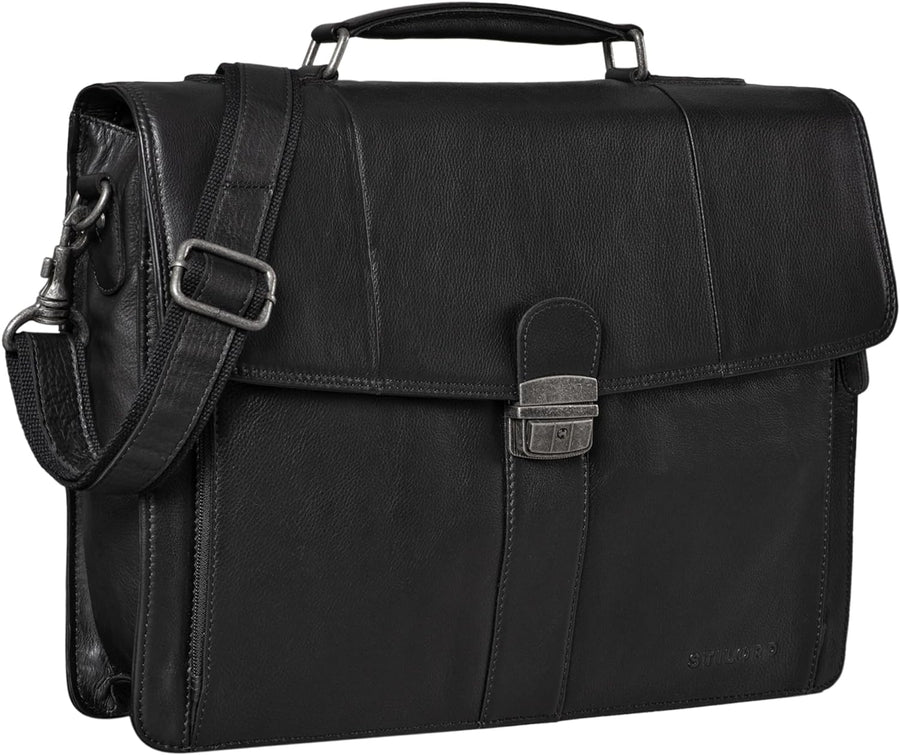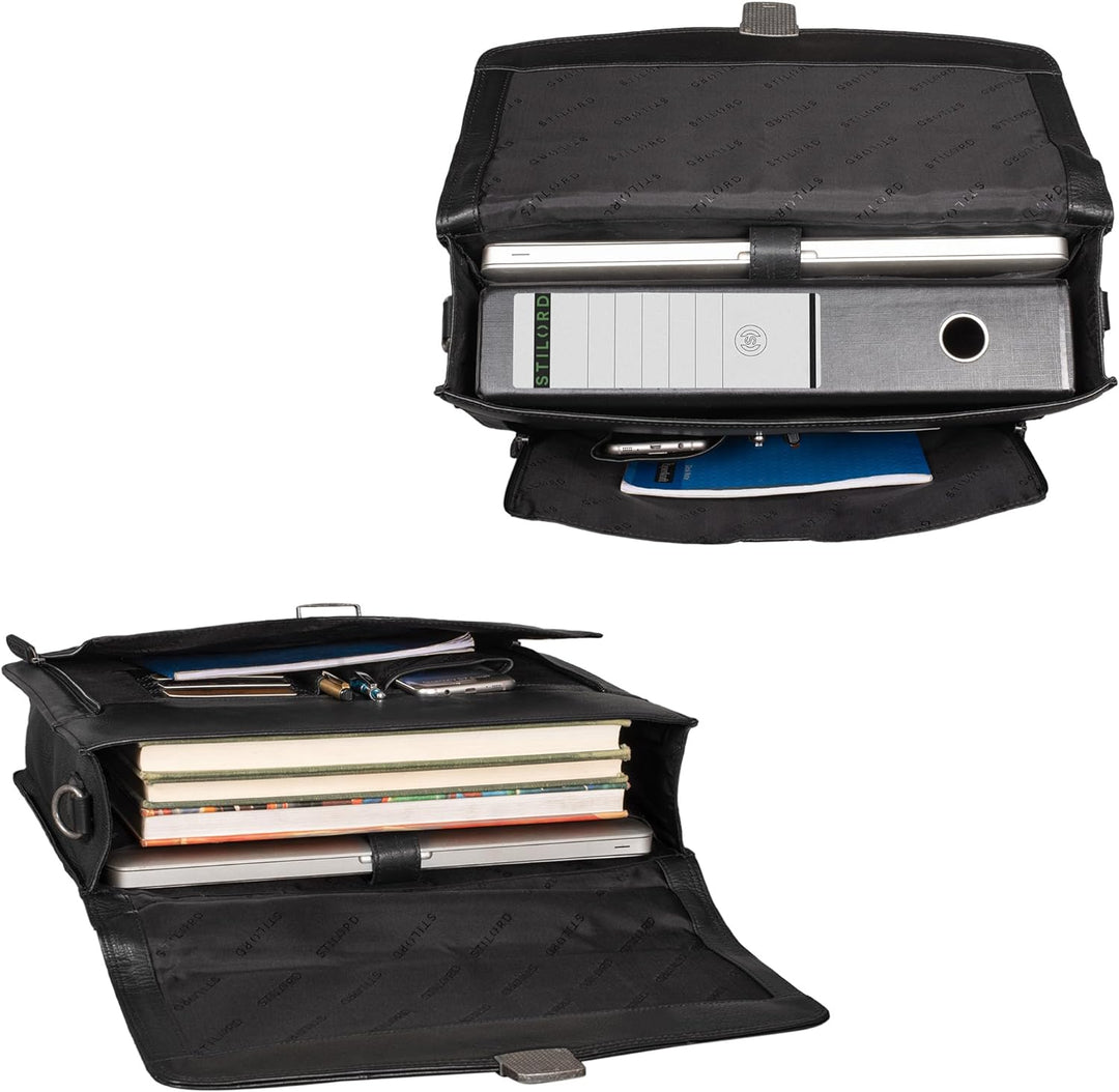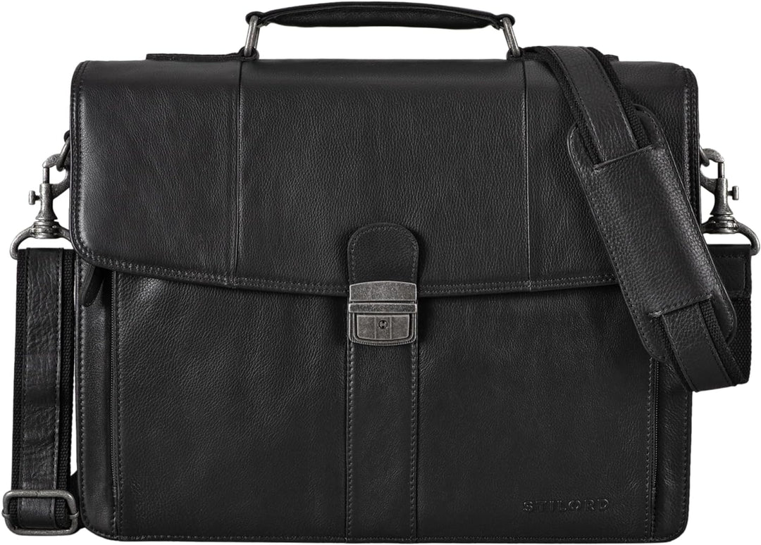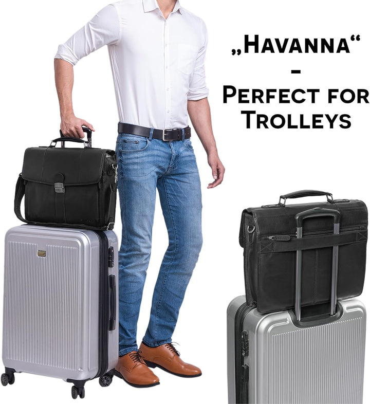 PRODUKTBESCHREIBUNGEN 'Havanna' Business-Tasche Leder Aktentasche Eine klassische Dokumentenmappe der jungen Marke STILORD für zeitloses, elegantes und elegantes Aussehen, aber auch für eine besonders gut organisierte Präsentation vor Kunden und Kollegen. Daher ermöglicht 'Havanna' die einfache Aufbewahrung eines DIN A4 Hemdes und gleichzeitig einen 15,6 Zoll Laptop im separaten Laptop-Fach. Eine Organisationsleiste mit EC-Kartenfächern, Einsteckfach und Stifthaltern runden das Sortiment ab. Besonders praktisch für Geschäftsreisen - auch wenn Sie nicht nach Kuba gehen: Die Business-Tasche 'Havanna' kann an den Einkaufswagen befestigt werden! Business-Tasche aus Leder 'Havanna' A4 - Intelligentes 2-in-1-Konzept: durch einen verstellbaren und abnehmbaren Schultergurt (65 - 130 cm, 3 cm breit) als Tragegriff oder Umhängetasche - sehr geräumiges Hauptfach für grosse Ordner | Bücher | Dokumente DIN A4 - Hochwertiges, robustes und einzigartiges Vollnarbenleder mit Vintage-Charakter - ungleichmässige Streifen und Farben machen Ihre Tasche zu einem Unikat. - klassisch, zeitlos und elegant als Arbeitstasche | Vintage Ledertasche | Business Tasche | Bürotasche | Dokumententasche | Laptoptasche - Aufteilung: 1 x Reissverschlussfach hinten | 1 x grosses Hauptfach | 1 x aufklappbares Nebenfach mit Organisationsstreifen - Organisationsleiste mit: 4 x EC Kartenfächer | 2 x Stifthalter | 1 x Steckfach - Masse (L x B x H): 40 x 9 x 32 cm | Modell: Havana | Material: Leder | Lederart: Rindsleder | Gewicht: 1550 Gramm | Kompatibilität: für grosse Hemden und Laptops 15,6 Zoll (separates Fach 38,5 x 26 cm)) | Montage auf Trolleys Mehr