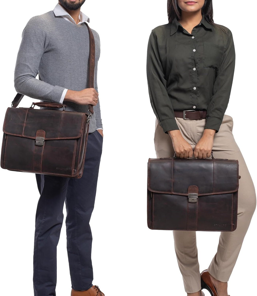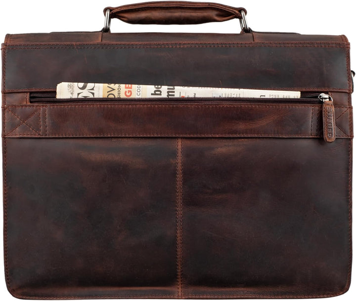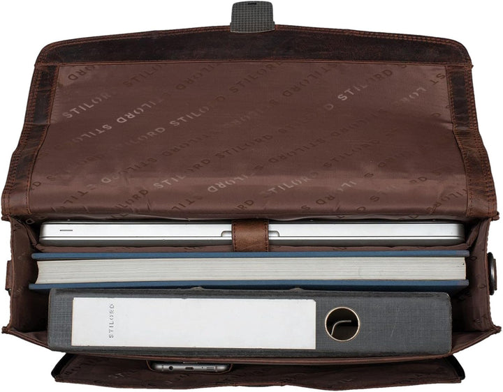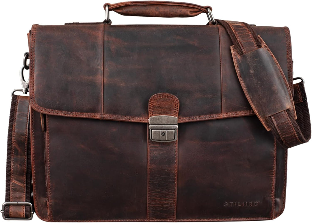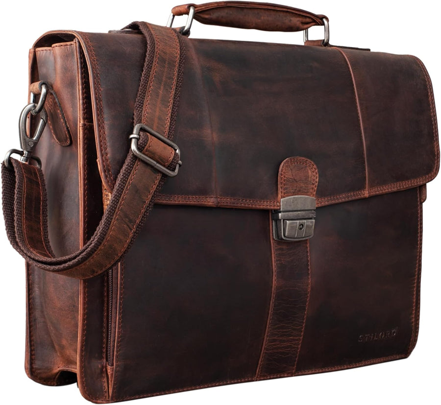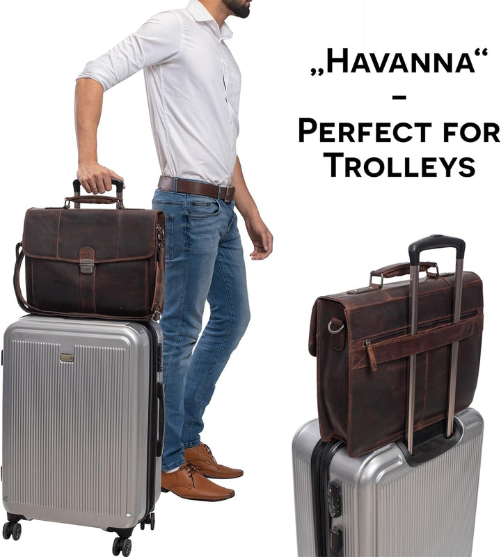 PRODUKTBESCHREIBUNGEN 'Havanna' Business-Tasche Leder Aktentasche Eine klassische Dokumentenmappe der jungen Marke STILORD für zeitloses, elegantes und elegantes Aussehen, aber auch für eine besonders gut organisierte Präsentation vor Kunden und Kollegen. Daher ermöglicht 'Havanna' die einfache Aufbewahrung eines DIN A4 Hemdes und gleichzeitig einen 15,6 Zoll Laptop im separaten Laptop-Fach. Eine Organisationsleiste mit EC-Kartenfächern, Einsteckfach und Stifthaltern runden das Sortiment ab. Besonders praktisch für Geschäftsreisen - auch wenn Sie nicht nach Kuba gehen: Die Business-Tasche 'Havanna' kann an den Einkaufswagen befestigt werden! Business-Tasche aus Leder 'Havanna' A4 - Intelligentes 2-in-1-Konzept: durch einen verstellbaren und abnehmbaren Schultergurt (65 - 130 cm, 3 cm breit) als Tragegriff oder Umhängetasche - sehr geräumiges Hauptfach für grosse Ordner | Bücher | Dokumente DIN A4 - Hochwertiges, robustes und einzigartiges Vollnarbenleder mit Vintage-Charakter - ungleichmässige Streifen und Farben machen Ihre Tasche zu einem Unikat. - klassisch, zeitlos und elegant als Arbeitstasche | Vintage Ledertasche | Business Tasche | Bürotasche | Dokumententasche | Laptoptasche - Aufteilung: 1 x Reissverschlussfach hinten | 1 x grosses Hauptfach | 1 x aufklappbares Nebenfach mit Organisationsstreifen - Organisationsleiste mit: 4 x EC Kartenfächer | 2 x Stifthalter | 1 x Steckfach - Masse (L x B x H): 40 x 9 x 32 cm | Modell: Havana | Material: Leder | Lederart: Rindsleder | Gewicht: 1550 Gramm | Kompatibilität: für grosse Hemden und Laptops 15,6 Zoll (separates Fach 38,5 x 26 cm)) | Montage auf Trolleys Mehr