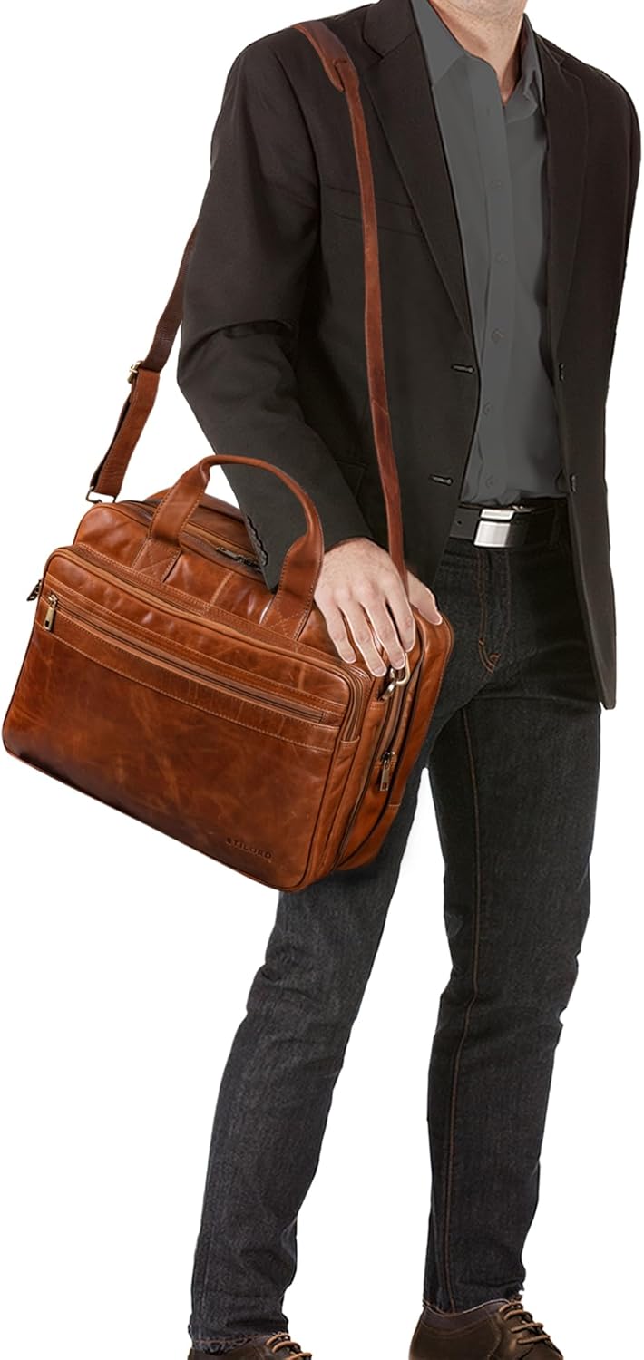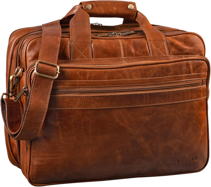 PRODUKTBESCHREIBUNGEN STILORD Umhängetasche Herren Ledertasche Aktentasche Praktische original STILORD Ledertasche in ansprechendem Design. Egal ob Smartphone, Stifte, Bücher, Tablet, grosse Aktenordner, Geschäftsunterlagen oder bis zu 15.6 Zoll grosse Laptops, hier sind Ihre Sachen gut und strukturiert aufgehoben. Durch ihre besondere Konstruktion kann die Tasche bei Bedarf mit Hilfe eines eingearbeiteten, praktischen Erweiterungsreissverschlusses in die Breite erweitert werden. Auf diese Weise entsteht zusätzlicher Platz für grössere Dinge, wie z.B. extra breite Aktenordner. Weiterhin verfügt die robuste Umhängetasche aus echtem Büffel Leder über einen bequemen, verstell- und abnehmbaren Schulterriemen. Innenaufteilung: Umhängetasche Herren Ledertasche - 1 x kleines Fach auf der Vorderseite - 1 x längliches Fach mit Einsteckfächer für Smartphone, Stifte und Kreditkarten - 1 x grosses Hauptfach, geeignet für MacBooks/ Laptops bis 15,6', Tablets, Bücher oder Aktenordner - 1 x grosses Nebenfach mit 3-Fach Trenner optimal für Mappen, Hefte, Zeitschriften, etc. - 1 x längliches, schmales Fach auf der Rückseite Highlights: - Masse (BxHxT): ca. 40 x 30 x 20 cm ( optimal für Aktenordner, Notebook, Bücher... ) - Abnehmbarer, verstellbarer Schulterriemen inkl. Schulterpolster - Ausstattung: 5 x Reissverschlussfächer , 1 x Smartphone-Fach , 3 x Stiftehalter , 4 x Kartenfächer - 3-Fach Trenner, um das hintere, grosse Fach zu unterteilen - Hauptfach (ungepolstert) geeignet für Notebooks bis 15,6 Zoll (38,5 cm) - separat herausnehmbare Laptophülle mit Massen von 34 x 24 cm für 14 Zoll Geräte geeignet - Echtes Naturprodukt! Somit können Farbabweichungen und Kratzer auftreten - Verschlussart: Reissverschluss - Masse: 40 x 32 x 20 cm | Modell: Leopold | Material: echtes Büffel-Leder | Vintage Design | Für den gleichzeitigen Transport von zwei grossen Aktenordnern geeignet