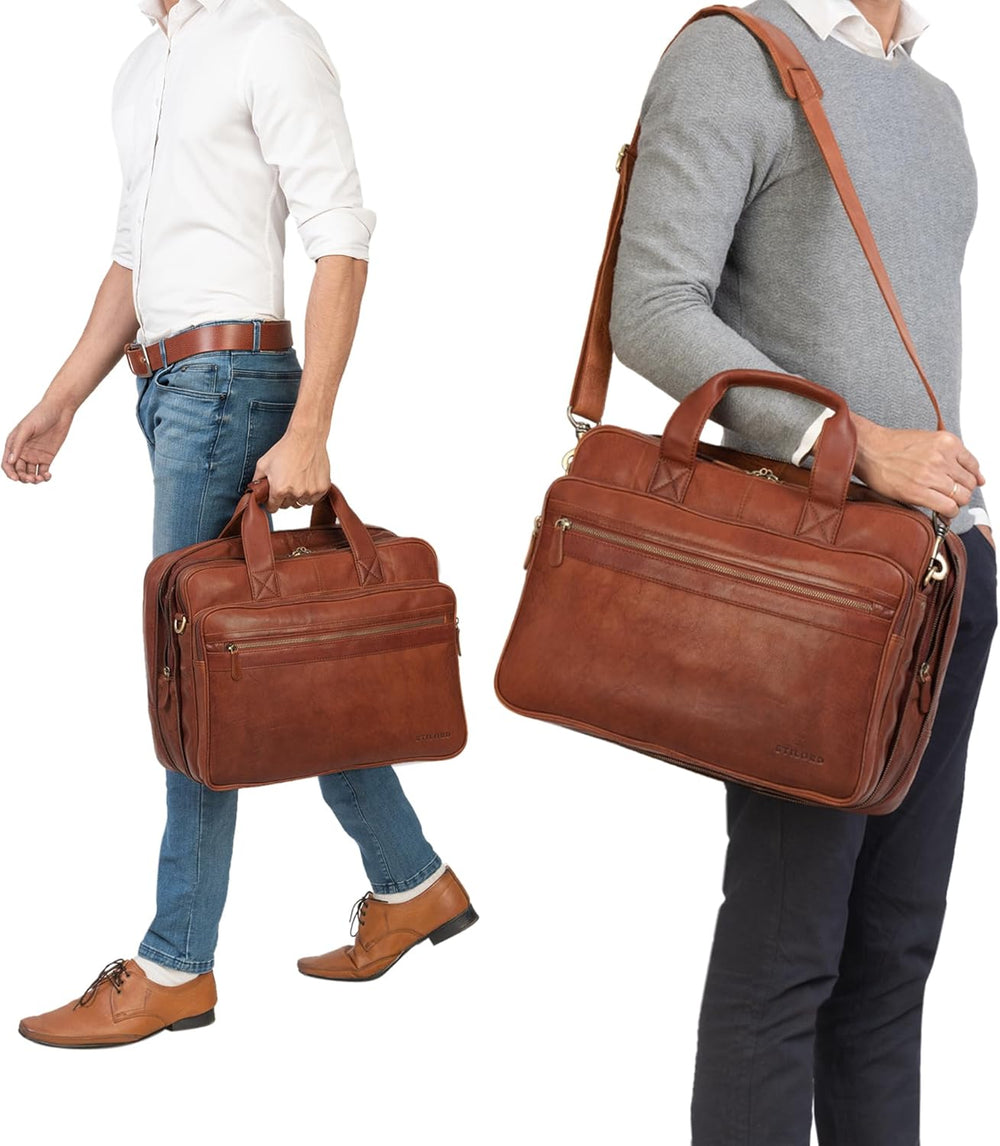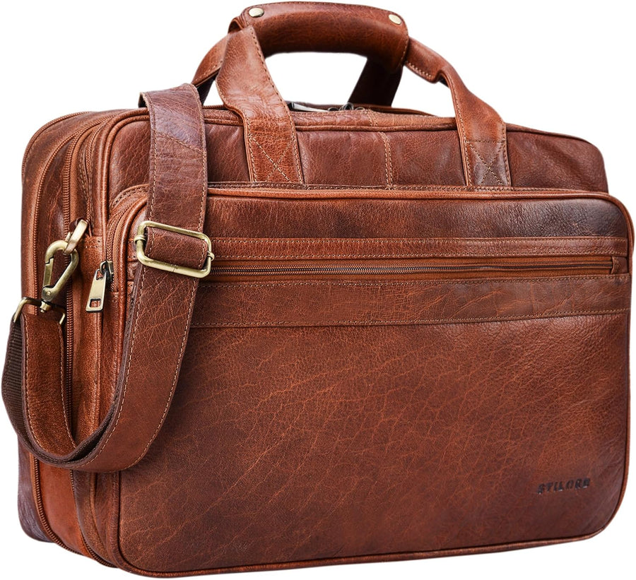 PRODUKTBESCHREIBUNGEN STILORD Umhängetasche Herren Ledertasche Aktentasche Praktische original STILORD Ledertasche in ansprechendem Design. Egal ob Smartphone, Stifte, Bücher, Tablet, grosse Aktenordner, Geschäftsunterlagen oder bis zu 15.6 Zoll grosse Laptops, hier sind Ihre Sachen gut und strukturiert aufgehoben. Durch ihre besondere Konstruktion kann die Tasche bei Bedarf mit Hilfe eines eingearbeiteten, praktischen Erweiterungsreissverschlusses in die Breite erweitert werden. Auf diese Weise entsteht zusätzlicher Platz für grössere Dinge, wie z.B. extra breite Aktenordner. Weiterhin verfügt die robuste Umhängetasche aus echtem Büffel Leder über einen bequemen, verstell- und abnehmbaren Schulterriemen. Innenaufteilung: Umhängetasche Herren Ledertasche - 1 x kleines Fach auf der Vorderseite - 1 x längliches Fach mit Einsteckfächer für Smartphone, Stifte und Kreditkarten - 1 x grosses Hauptfach, geeignet für MacBooks/ Laptops bis 15,6', Tablets, Bücher oder Aktenordner - 1 x grosses Nebenfach mit 3-Fach Trenner optimal für Mappen, Hefte, Zeitschriften, etc. - 1 x längliches, schmales Fach auf der Rückseite Highlights: - Masse (BxHxT): ca. 40 x 30 x 20 cm ( optimal für Aktenordner, Notebook, Bücher... ) - Abnehmbarer, verstellbarer Schulterriemen inkl. Schulterpolster - Ausstattung: 5 x Reissverschlussfächer , 1 x Smartphone-Fach , 3 x Stiftehalter , 4 x Kartenfächer - 3-Fach Trenner, um das hintere, grosse Fach zu unterteilen - Hauptfach (ungepolstert) geeignet für Notebooks bis 15,6 Zoll (38,5 cm) - separat herausnehmbare Laptophülle mit Massen von 34 x 24 cm für 14 Zoll Geräte geeignet - Echtes Naturprodukt! Somit können Farbabweichungen und Kratzer auftreten - Verschlussart: Reissverschluss - Masse: 40 x 32 x 20 cm | Modell: Leopold | Material: echtes Büffel-Leder | Vintage Design | Für den gleichzeitigen Transport von zwei grossen Aktenordnern geeignet