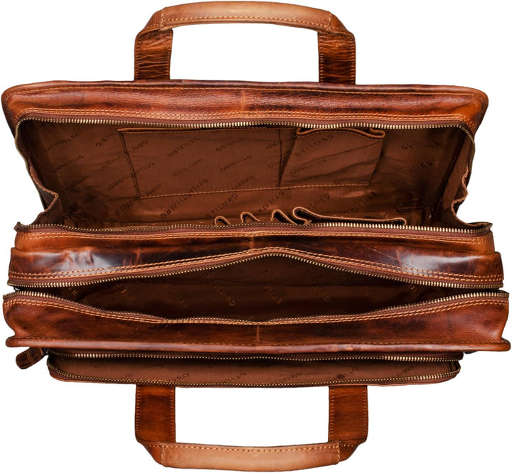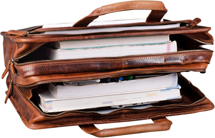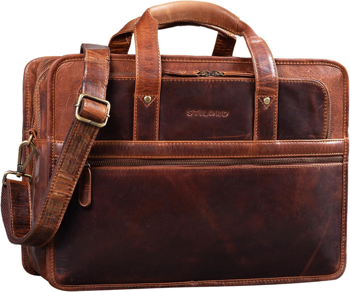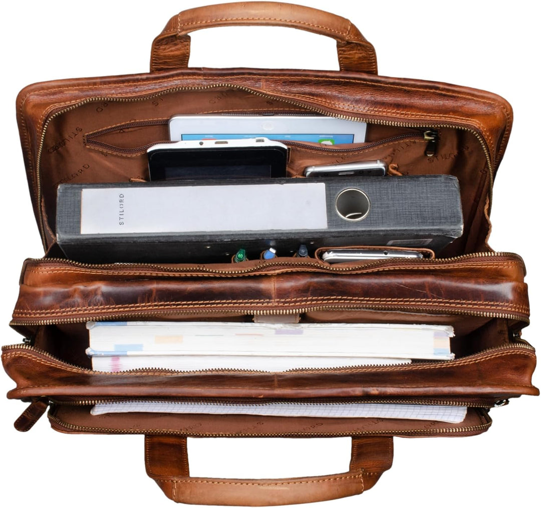 PRODUKTBESCHREIBUNGEN 'Yves' Herren Leder Handtuch XL PERFEKT FÜR BERUFSLEBEN UND GESCHÄFTSORDNUNG - Eine grosse Ledertasche mit vielen Fächern, viel Platz & viel Stil. Der gerade Schnitt macht die Ledertasche einzigartig und unnachahmlich. Mit 'Yves' wirken sie stilistisch selbstbewusst und repräsentativ. Die beiden Hauptfächer überzeugen durch viele Einsteck- und Reissverschlussfächer und ermöglichen eine vorbildliche Organisation. Der Transport von grossen Aktonordern und 15,6-Zoll-Laptops war noch nie so stylisch - endlich macht der Weg ins Büro wieder Spass! Grosse Aktentasche aus Leder für Herren - alles auf einen Blick - Vintage Business Tasche aus echtem Rindsleder - robust, langlebig und edel zugleich! - Ideal für den gleichzeitigen Transport von zwei Dateibefehlen - verstellbarer und abnehmbarer Schultergurt (75 - 130 cm) - Praktische Organisationsleiste und viele Fächer innen und aussen - zwei geräumige Hauptfächer und ein separates Laptopfach mit 15,6 Zoll - Reissverschluss an den beiden Hauptfächern - Aufteilung: 2 Hauptfächer DIN A4, getrennt von einer Reissverschlussfachwand | 1 Nebenfach mit Organisationsstreifen: 3 x EC-Kartenfach, 3 x Stifthalter, 3 x Smartphone oder Portemonnaie | 1 x Laptopfach 15,6 Zoll (38,5 x 26 cm) | 2 x Reissverschlussfach vorne | 1 x Fach zip zip hinten - Masse: 42 x 31 x 8 cm | Modell: Yves | Gewicht: 1700 Gramm | Material: echtes Rindsleder | Für Männer und Frauen | Hersteller: STILORD | 1 x 15,6 Zoll Laptopfach (38,5 x 26 cm)
