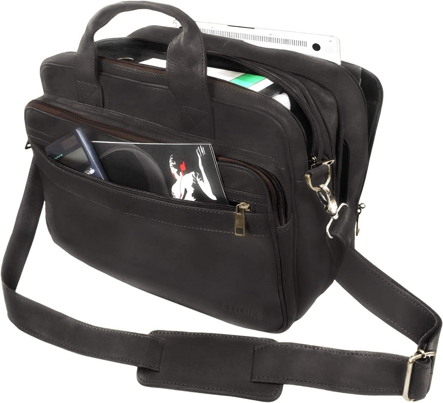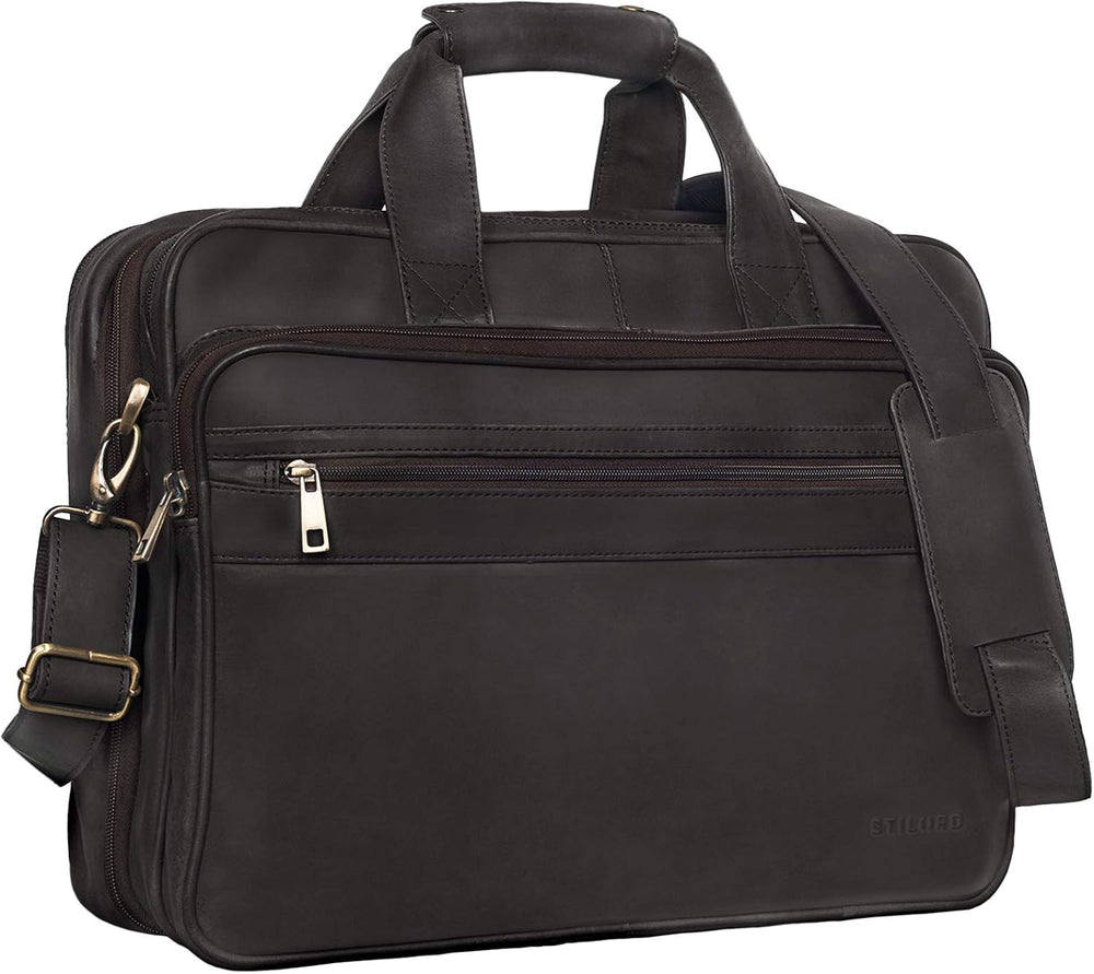 PRODUKTBESCHREIBUNGEN STILORD Umhängetasche Herren Ledertasche Aktentasche Praktische original STILORD Ledertasche in ansprechendem Design. Egal ob Smartphone, Stifte, Bücher, Tablet, grosse Aktenordner, Geschäftsunterlagen oder bis zu 15.6 Zoll grosse Laptops, hier sind Ihre Sachen gut und strukturiert aufgehoben. Durch ihre besondere Konstruktion kann die Tasche bei Bedarf mit Hilfe eines eingearbeiteten, praktischen Erweiterungsreissverschlusses in die Breite erweitert werden. Auf diese Weise entsteht zusätzlicher Platz für grössere Dinge, wie z.B. extra breite Aktenordner. Weiterhin verfügt die robuste Umhängetasche aus echtem Büffel Leder über einen bequemen, verstell- und abnehmbaren Schulterriemen. Innenaufteilung: Umhängetasche Herren Ledertasche - 1 x kleines Fach auf der Vorderseite - 1 x längliches Fach mit Einsteckfächer für Smartphone, Stifte und Kreditkarten - 1 x grosses Hauptfach, geeignet für MacBooks/ Laptops bis 15,6', Tablets, Bücher oder Aktenordner - 1 x grosses Nebenfach mit 3-Fach Trenner optimal für Mappen, Hefte, Zeitschriften, etc. - 1 x längliches, schmales Fach auf der Rückseite Highlights: - Masse (BxHxT): ca. 40 x 30 x 20 cm ( optimal für Aktenordner, Notebook, Bücher... ) - Abnehmbarer, verstellbarer Schulterriemen inkl. Schulterpolster - Ausstattung: 5 x Reissverschlussfächer , 1 x Smartphone-Fach , 3 x Stiftehalter , 4 x Kartenfächer - 3-Fach Trenner, um das hintere, grosse Fach zu unterteilen - Hauptfach (ungepolstert) geeignet für Notebooks bis 15,6 Zoll (38,5 cm) - separat herausnehmbare Laptophülle mit Massen von 34 x 24 cm für 14 Zoll Geräte geeignet - Echtes Naturprodukt! Somit können Farbabweichungen und Kratzer auftreten - Verschlussart: Reissverschluss - Masse: 40 x 32 x 20 cm | Modell: Leopold | Material: echtes Büffel-Leder | Vintage Design | Für den gleichzeitigen Transport von zwei grossen Aktenordnern geeignet