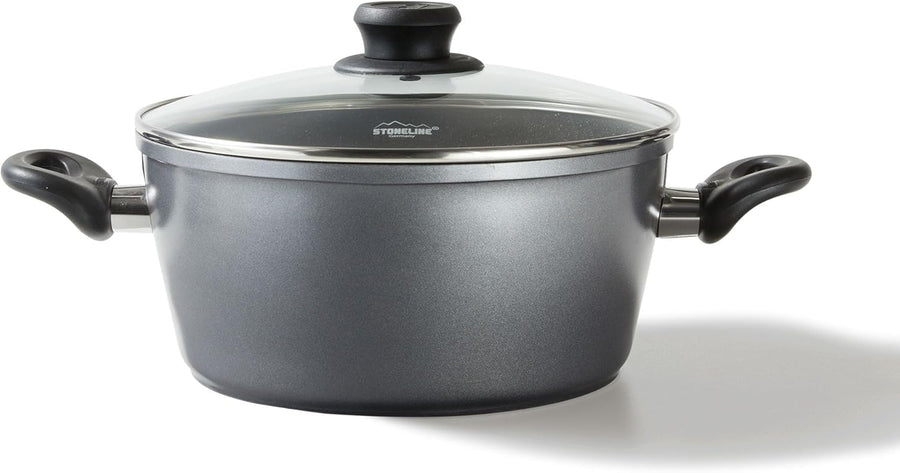 - Lieferumfang: 1 x Stoneline Topf, ø 28 cm, Höhe: ca. 13,5 cm, Fassungsvermögen: ca. 6,9 L, Induktionsboden: ø: ca. 20,3 cm ; 1 x Glasdeckel, Ø 28 cm; Material: Aluminium.