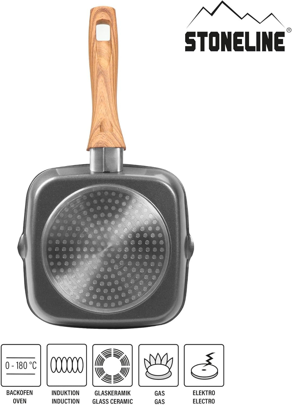 - Lieferumfang: 1 x STONELINE Grill-Eckpfanne mit Griff in Holzoptik; 16 x 16 cm, Höhe 3,3 cm, Fassungsvermögen: ca. 0,6 L, Material: Aluminium mit Kunststoffgriff, Farbe: Grau, Artikelnummer: 22042