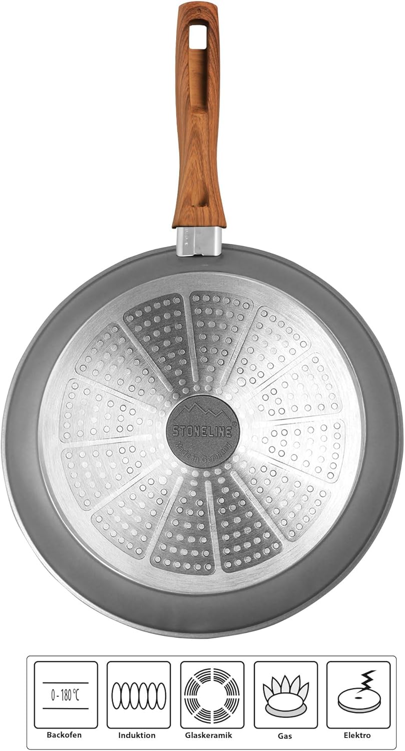 - Die Stoneline Schmorpfanne 28 cm ermöglicht ein fett- und ölfreies Braten von Fleisch und Fisch, die Brat- & Schmorpfannen können aber auch wie gewohnt zum Braten mit Fett oder Öl genutzt werden.