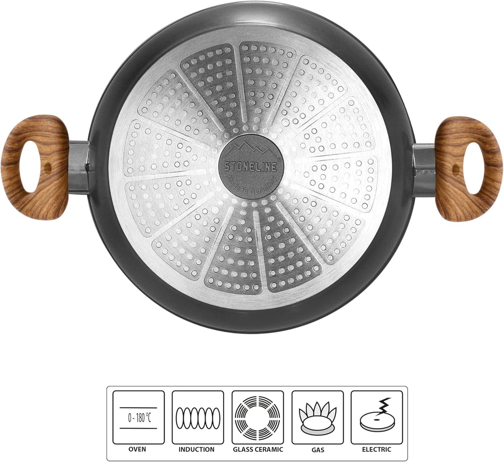 - Die speziell entwickelte STONELINE Beschichtung mit echten Steinpartikeln zeichnet sich durch optimale Antihaft-Eigenschaften bei gleichzeitig robuster und kratzfester Oberfläche aus.