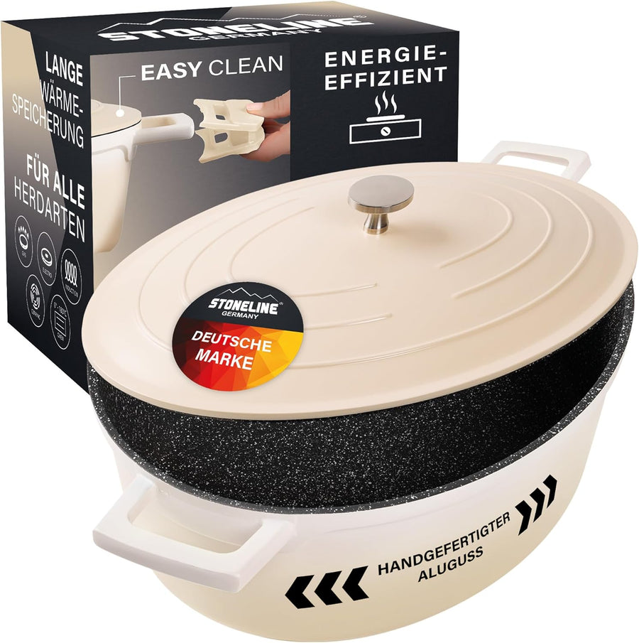 - Egal ob Stoneline Pfanne, Topf oder Bräter: Der Aluguss Topf ist einsetzbar für Gaskocher, Glaskeramik-, Induktion- und Elektrofelder. Der Bräter mit Deckel backofengeeignet bis 240°C ohne Thermogriffschützer / 200 °C mit Thermogriffschützern.
