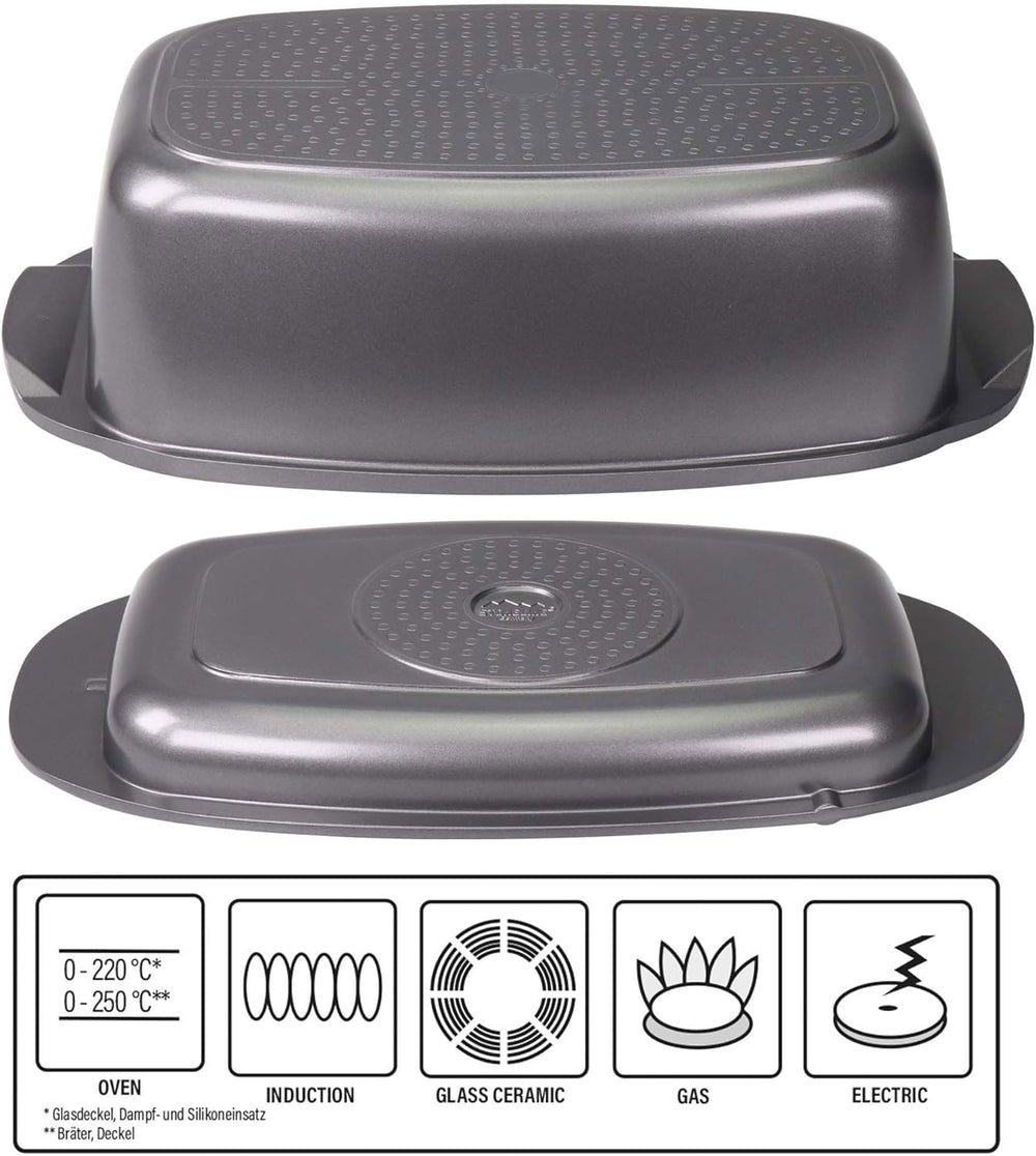 - Für alle Herdarten geeignet auch Induktion: Der Bräter mit Einsätzen ermöglichen es Vitaminschonend zu kochen. Kein Anbrennen und kein Ankleben. Vom Braten bis zum Gemüse dampfen alles ist mit dem multifunktionalem Bräter möglich