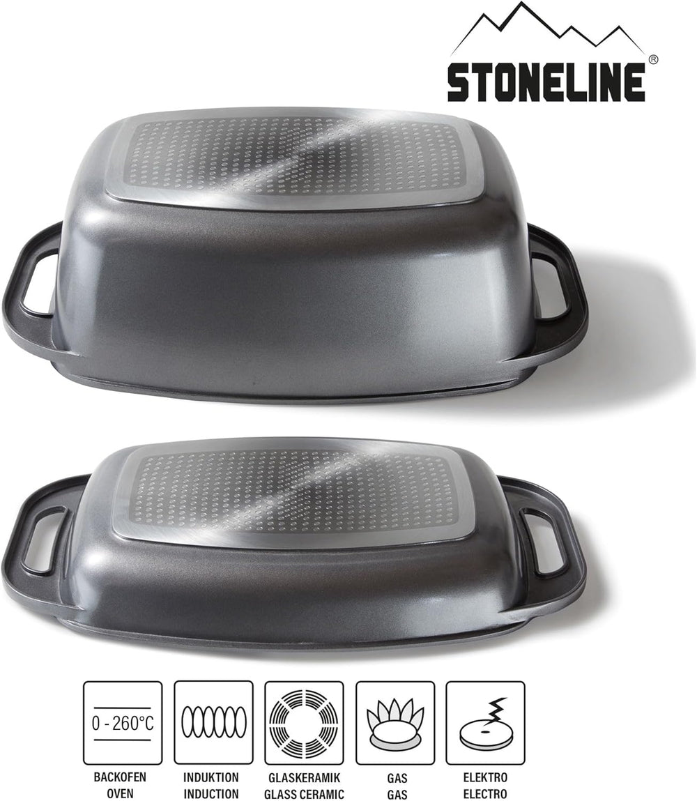 - Stoneline Bräter mit Deckel ermöglicht ein fett- und ölfreies Braten von Fleisch, Fisch & Gemüse. Der Schmortopf ist antihaftbeschichtet, was das Anbrennen im Aluguss Topf oder Deckel verhindert.