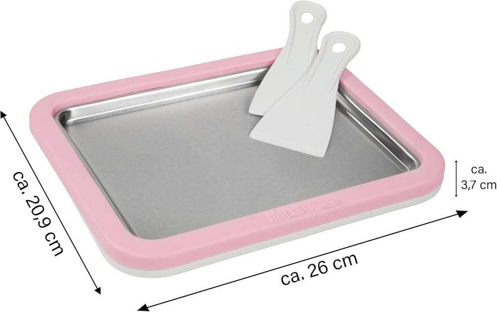 - Lieferumfang: 1 STONELINE Ice Cream Rolls Maker, ca. 26 x 20,9 cm, Höhe ca. 3,7 cm, Masse Eisplatte ca. 21,3 x 16,3 cm; 2 Spatel; 1 Gebrauchsanleitung mit Rezepten; Material Platte: Edelstahl, Spatel: Kunststoff; Farbe Platte: Rosa, Spatel: weiss