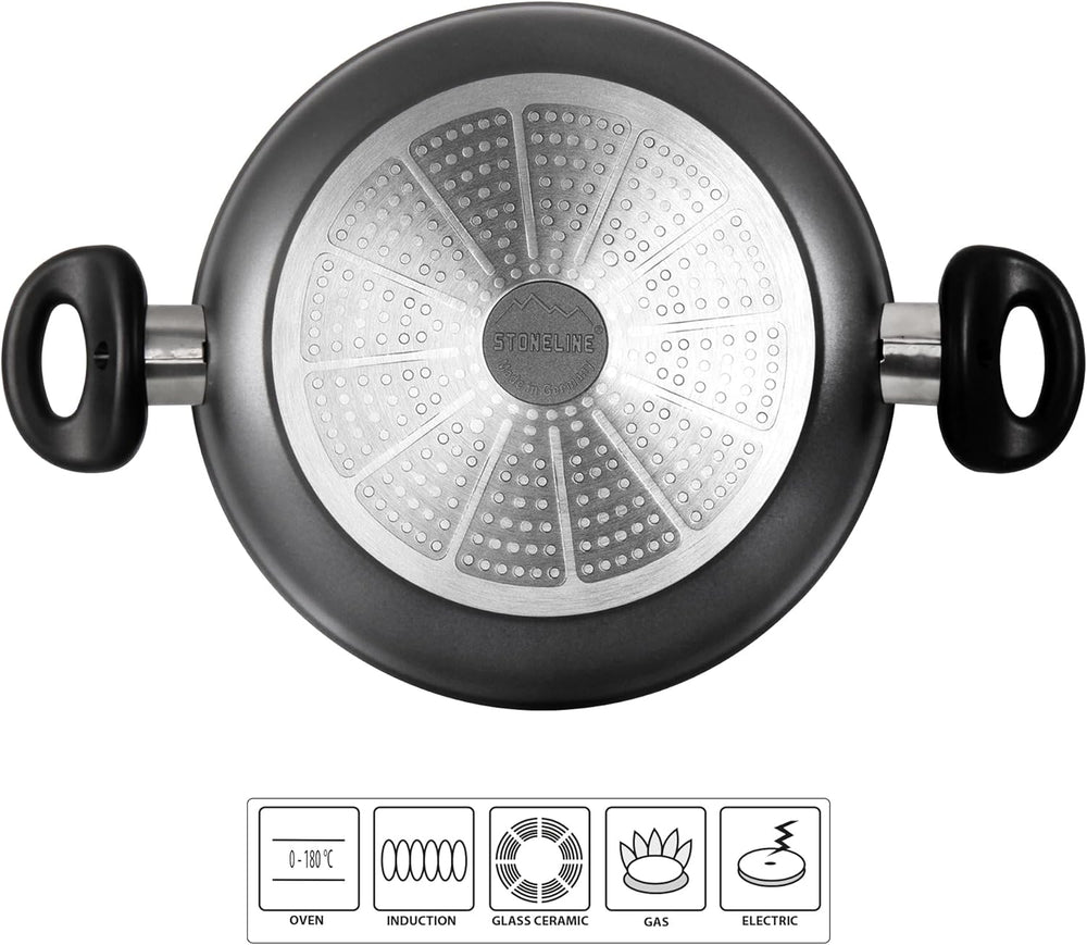 - Die speziell entwickelte STONELINE Beschichtung mit echten Steinpartikeln zeichnet sich durch optimale Antihaft-Eigenschaften bei gleichzeitig robuster und kratzfester Oberfläche aus.