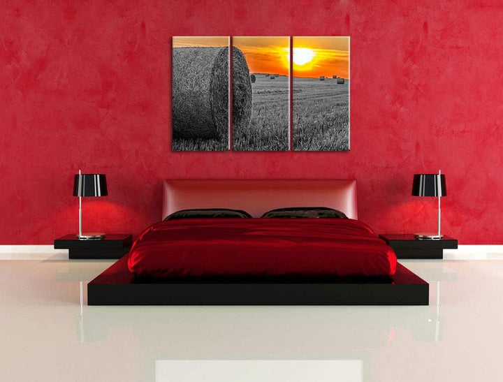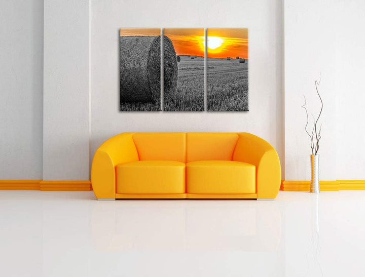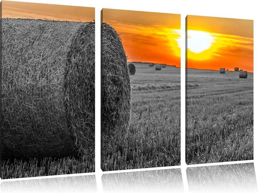 Strohballen auf Feld bei Sonnenuntergang schwarz/weiss 3-Teiler Leinwandbild 120x80 Bild auf Leinwan