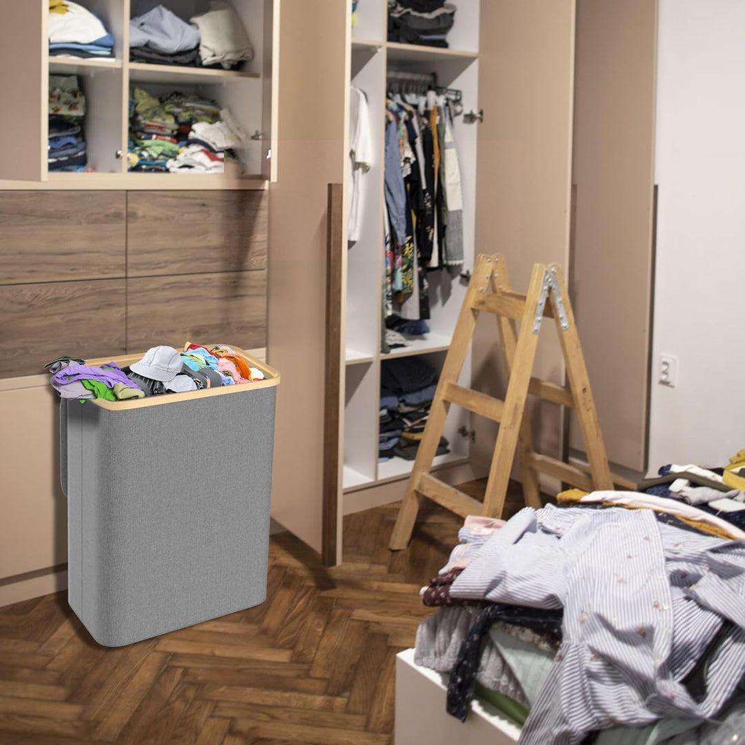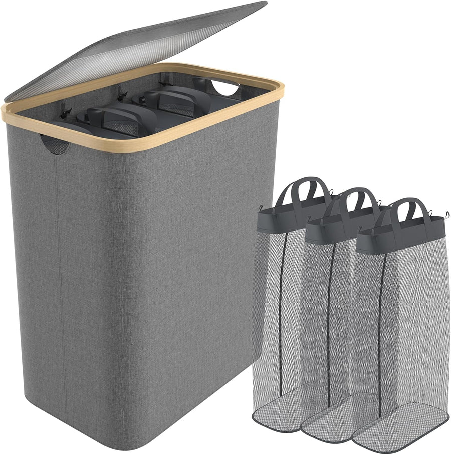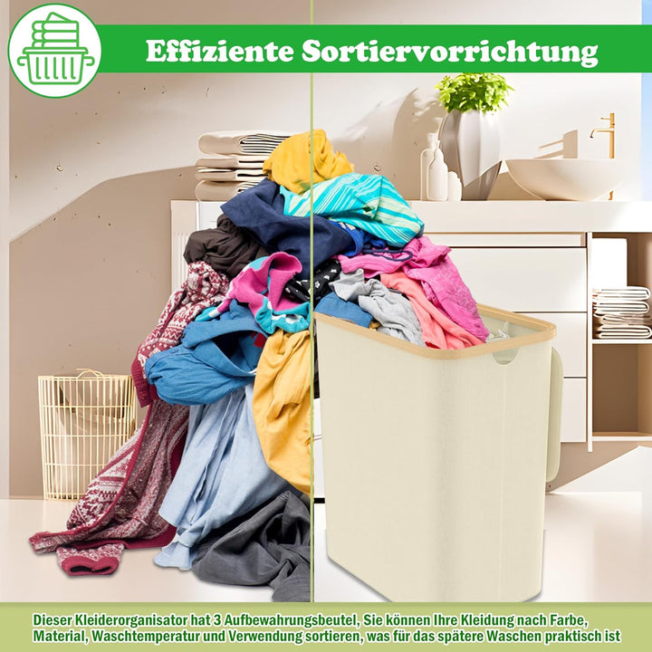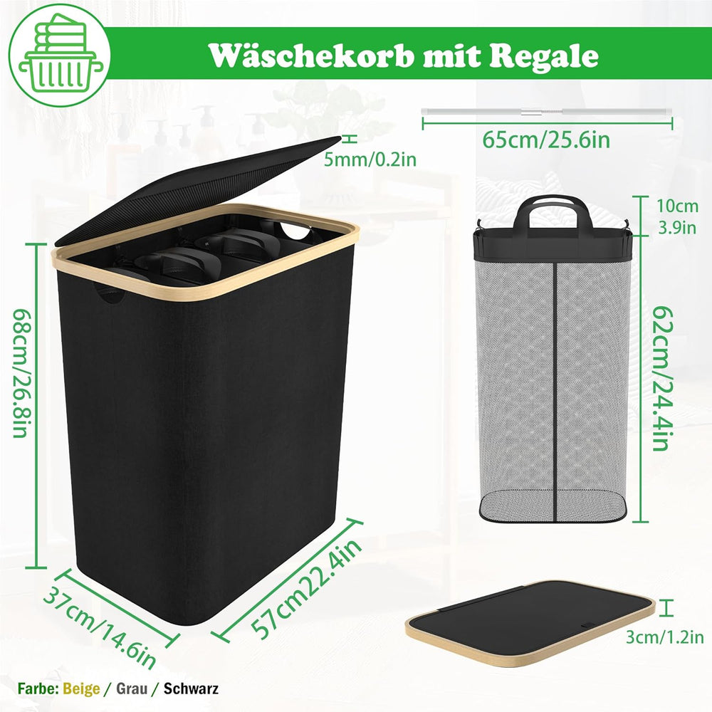 - Wäschekorb mit Regale: Gesamtkapazität: 140L (3x46L), Material: Oxford-Stoff Stofftasche + Bambus Rahmen, Farbe: Beige / Grau / Schwarz, Gesamtgrösse: 56,5 x 37 x 67,5 cm