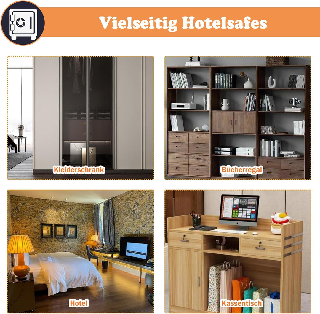 • 【Vielseitig Hotelsafes】Der kleine Tresor kann in Szenarien wie Geschäften, Restaurants, Bars, Hotels, Büros und Privathäusern verwendet werden, um Bargeld, Dokumente, Schmuck und andere wichtige Gegenstände aufzubewahren.