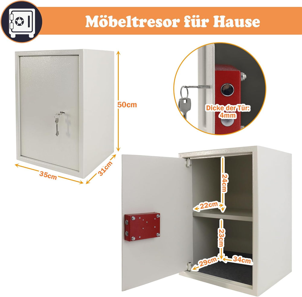 • 【Möbeltresor】Material: Stahl, Farbe: Silber, Es sind zwei Grössen erhältlich: 31x20x20cm / 35x50x31cm.