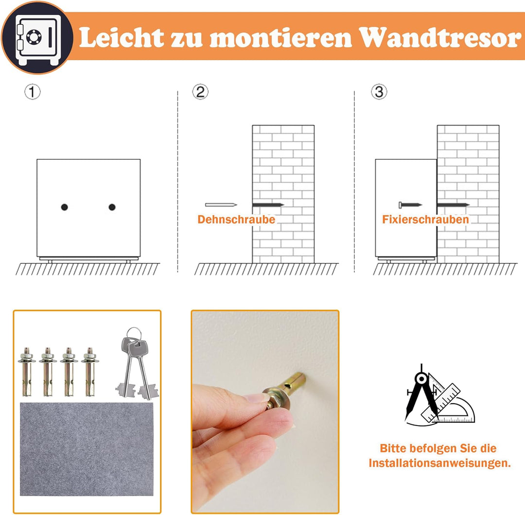 • 【Leicht zu montieren Wandtresor】Der Tresor wird mit 4 Befestigungsschrauben und 4 Stiften für die sichere Montage an der Wand oder am Boden geliefert.