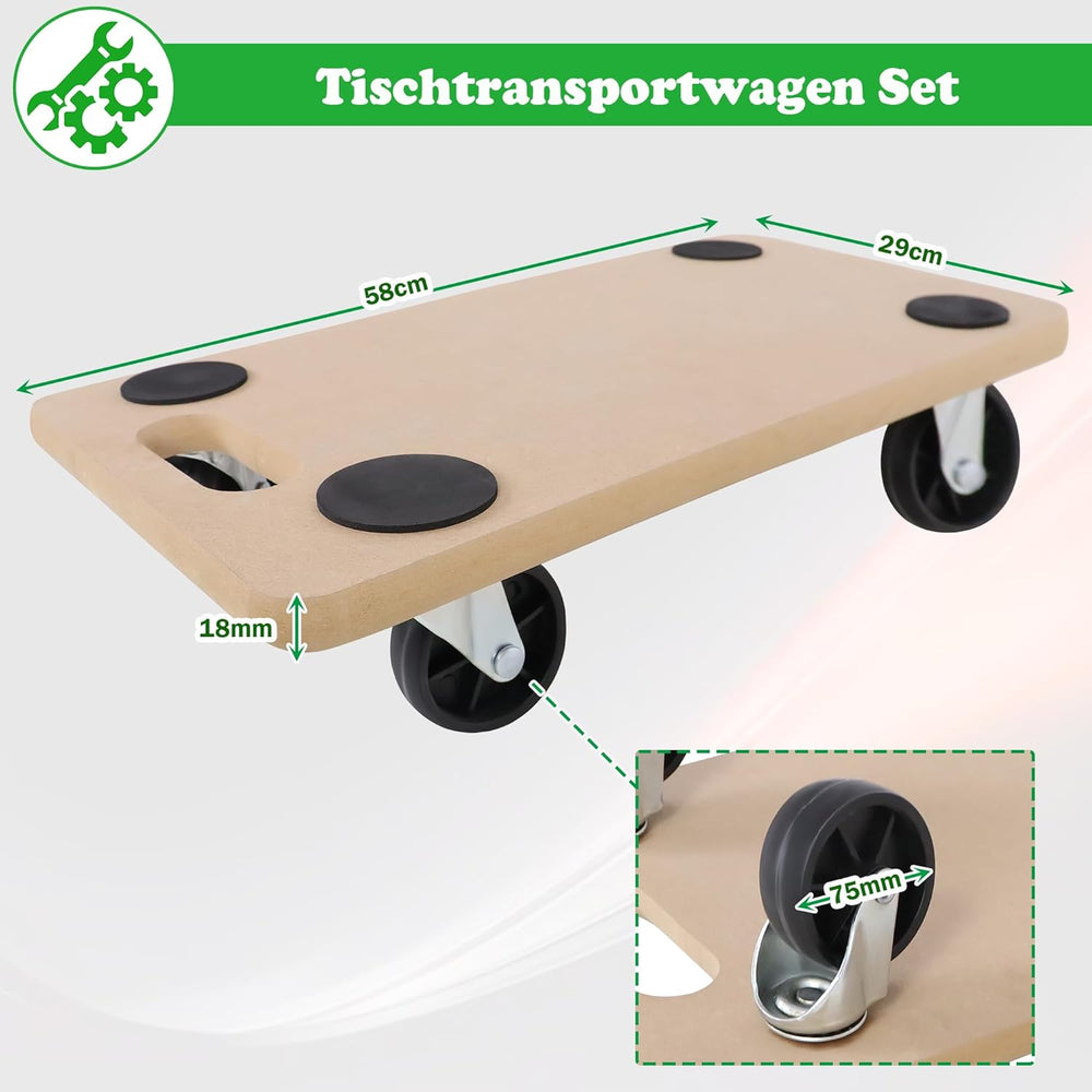 - 【Tischtransportwagen Set】Material: MDF Platten + Kunststoff Rollen, Grösse (LxBxH): 58x29x11cm, Raddurchmesser: 75mm, Tragfähigkeit: max. 200KG, Optionaler Bausatz: 2 Stück / 4Stück.