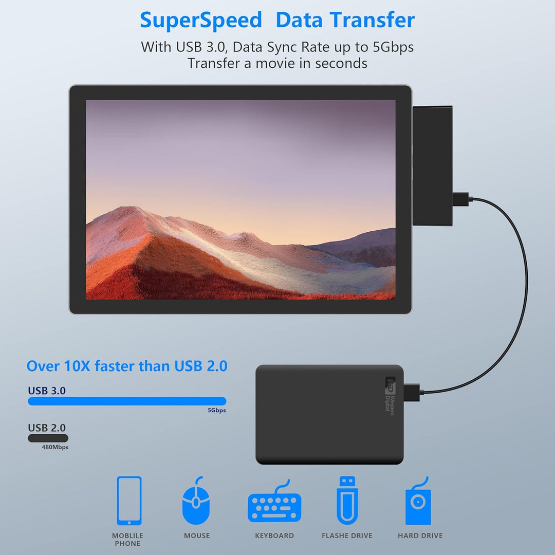 - 【2 SuperSpeed USB 3.0-Anschlüsse und praktische Erweiterungsdatenanschlüsse】 Mit 2 USB 3.0-Anschlüssen kann dieser Microsoft Surface Pro 7-Hub Daten mit bis zu 5 Gbit / s übertragen und unterstützt USB-Tastatur, Maus, USB-Treiber und