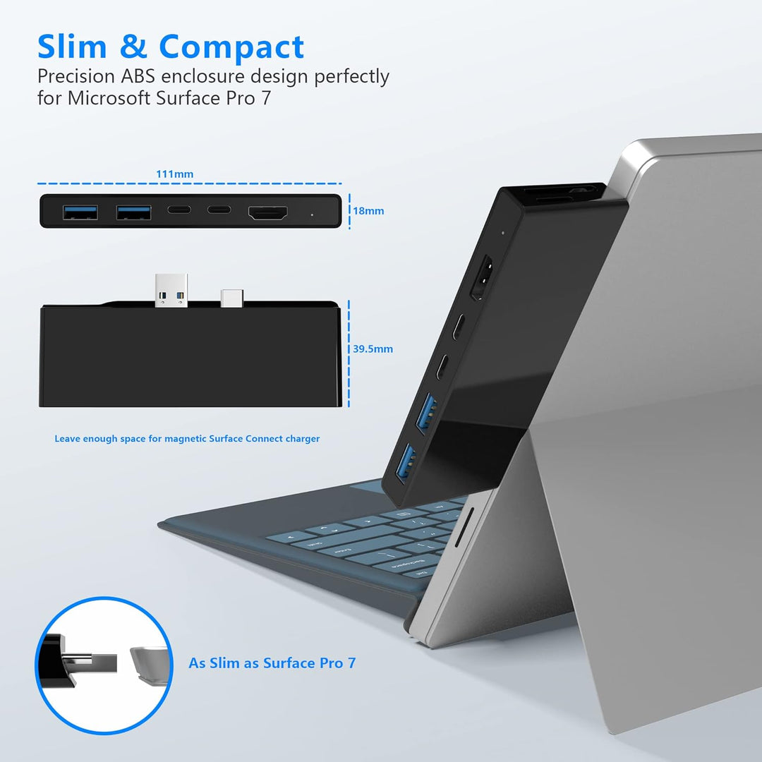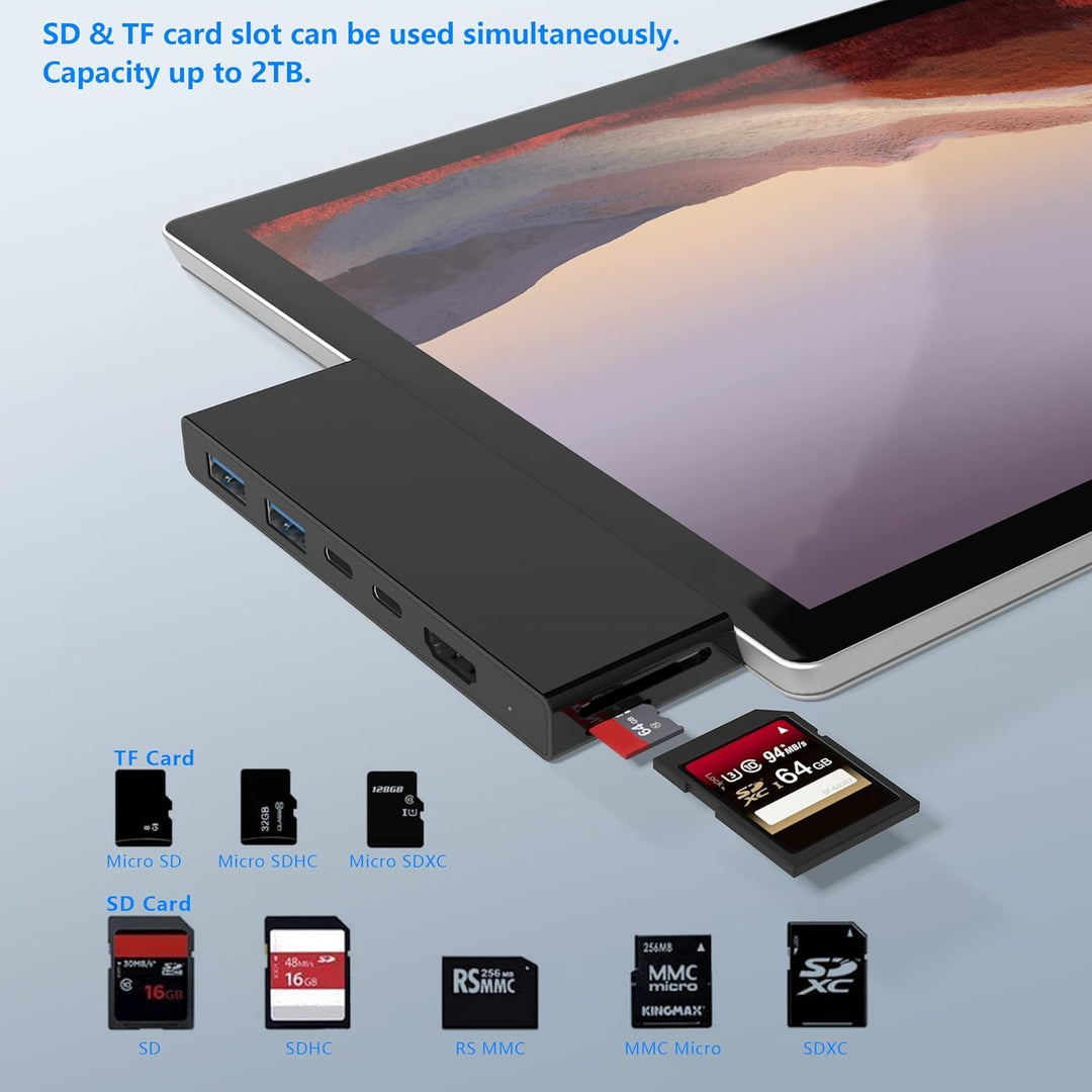 - 【Design für Surface Pro 7】 Surface Pro 7 Hub Verwandelt die USB-A-Verbindung und USB C in 7 Anschlüsse (HDMI 4K / 30Hz, USB C 60W PD-Ladeanschluss, USB C 5 Gbit / s-Datenanschluss, 2 USB 3.0-Anschluss, SD & MicroSD-Kartenleser) * Hinweis 1: Dieses