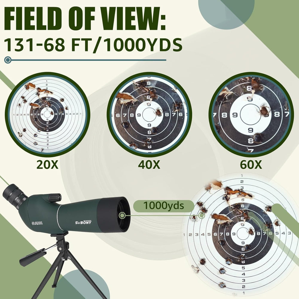 - Dieses Spektiv verfügt über ein Sichtfeld von 131-68ft/1000yds und einen leistungsstarken Zoom-Vergrösserungsbereich; der eine 20- bis 60-fache Vergrösserung ermöglicht; Das ergonomische Design des um 45 Grad abgewinkelten Okulars ermöglicht eine