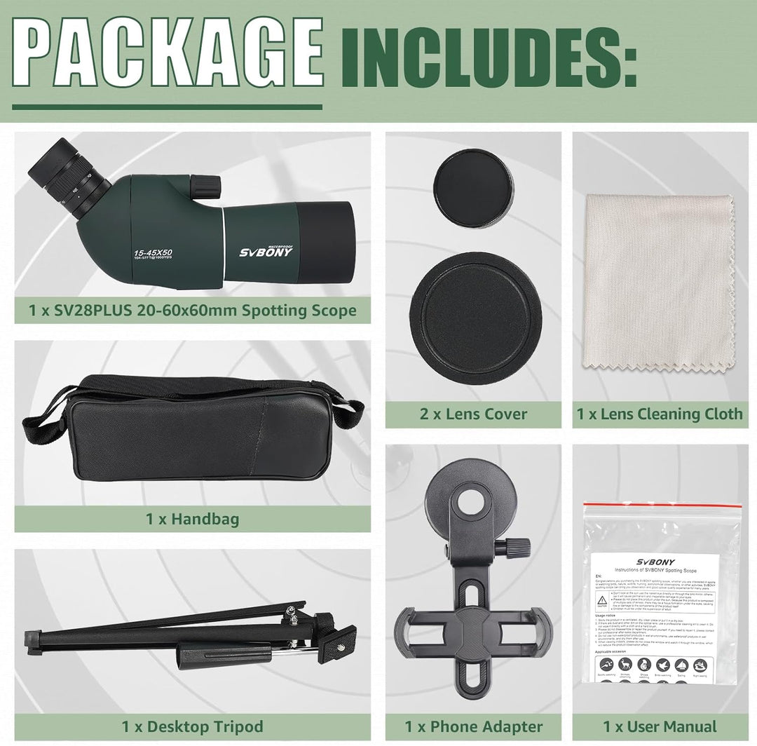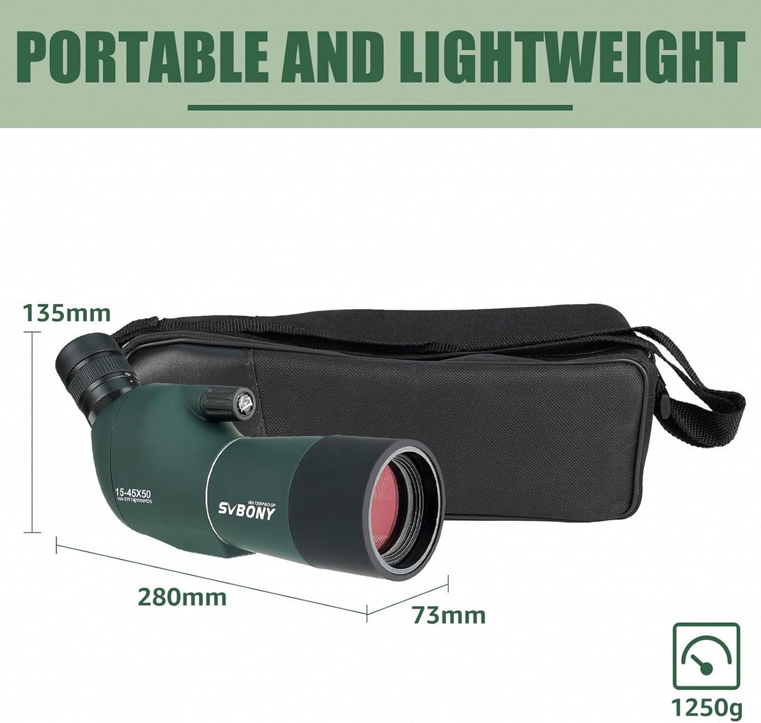 - Das SV28PLUS 15–45x50mm ist für die Zielbeobachtung für Anfänger konzipiert; einfach zu fokussieren und die Vergrösserung zu ändern; einfache Einrichtung bei der Beobachtung von Zielen und Landschaften