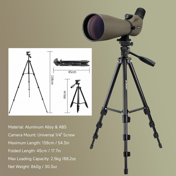 - Stativ in voller Grösse; Der SV401 wird mit einem soliden Aluminiumkamerastativ geliefert; Stabil und leicht; Mit der Drehstativhalterung können Sie das Okular so einstellen; dass es in jeder Position mit einem bequemen Winkel angezeigt werden kann