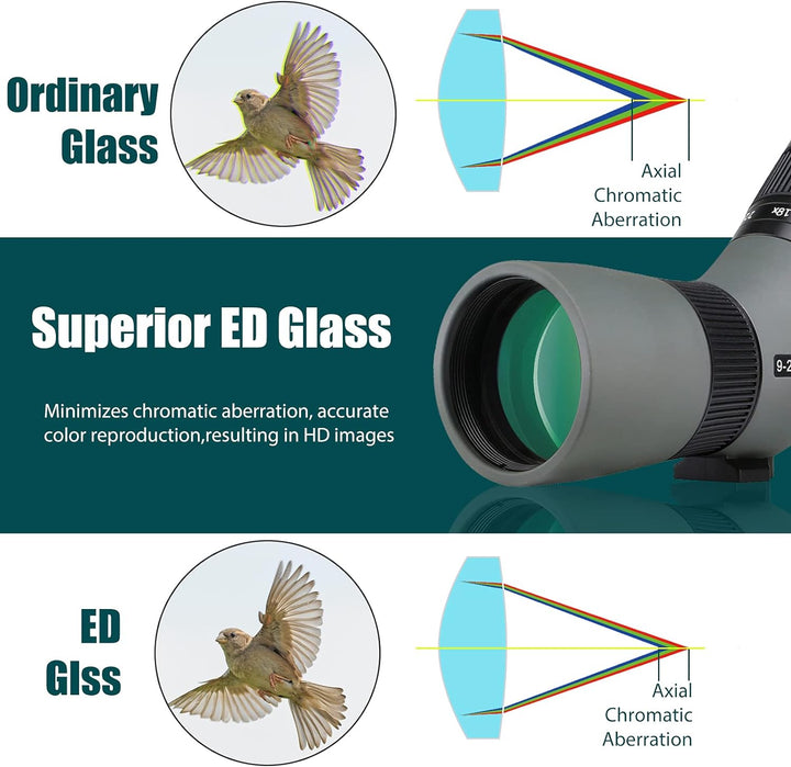 - ED Spotting Scope; Ausgestattet mit ED-Glas (Extra-Low Dispersion) zur Beseitigung chromatischer Aberration und zur Bereitstellung von Bildern mit hervorragender Auflösung und hervorragendem Kontrast