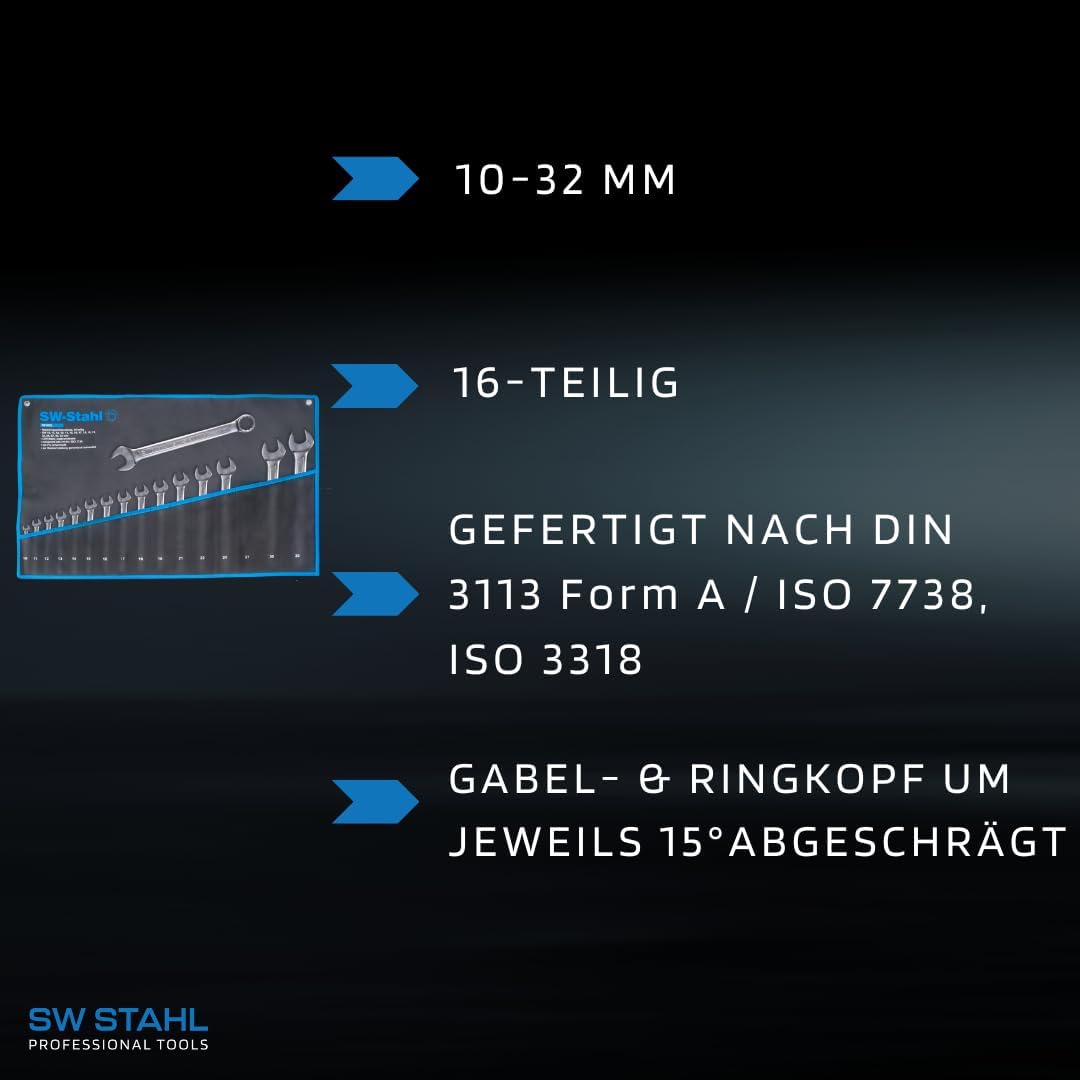 - Dieser Maulschlüssel-Satz mit SW-Stahl PRO DRIVE PROFIL ist optimal für Heimwerker und Profis: Das Maulschlüsselset ist aus hochwertigem Chrom-Vanadium gefertigt, welches ideal für Arbeiten in der Werkstatt, im Haus, beim Hobby, im Garten und Beruf