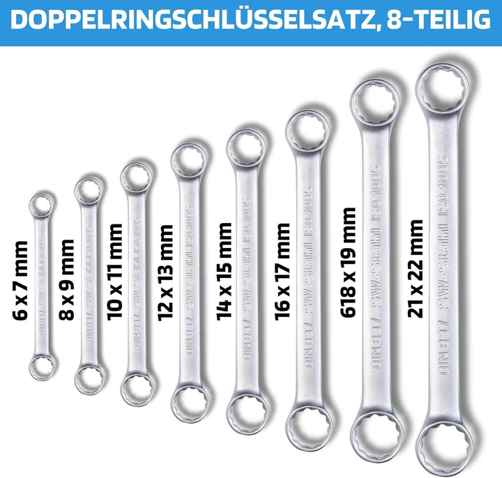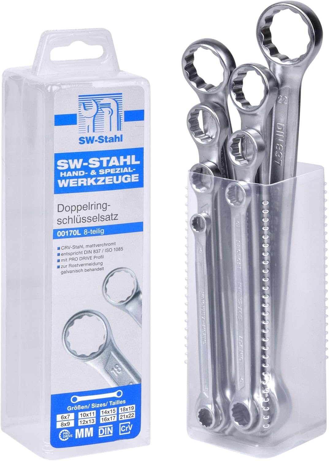 - Lieferumfang: 1x SW-Stahl Doppelringschlüsselsatz 8-tlg. in praktischer Kunststoffröhre mit EURO-Hänger: Ringschlüssel 6 x 7, Ringschlüssel 8 x 9, Ringschlüssel 10 x 11, Ringschlüssel 12 x 13, Ringschlüssel 14 x 15, Ringschlüssel 16 x 17,