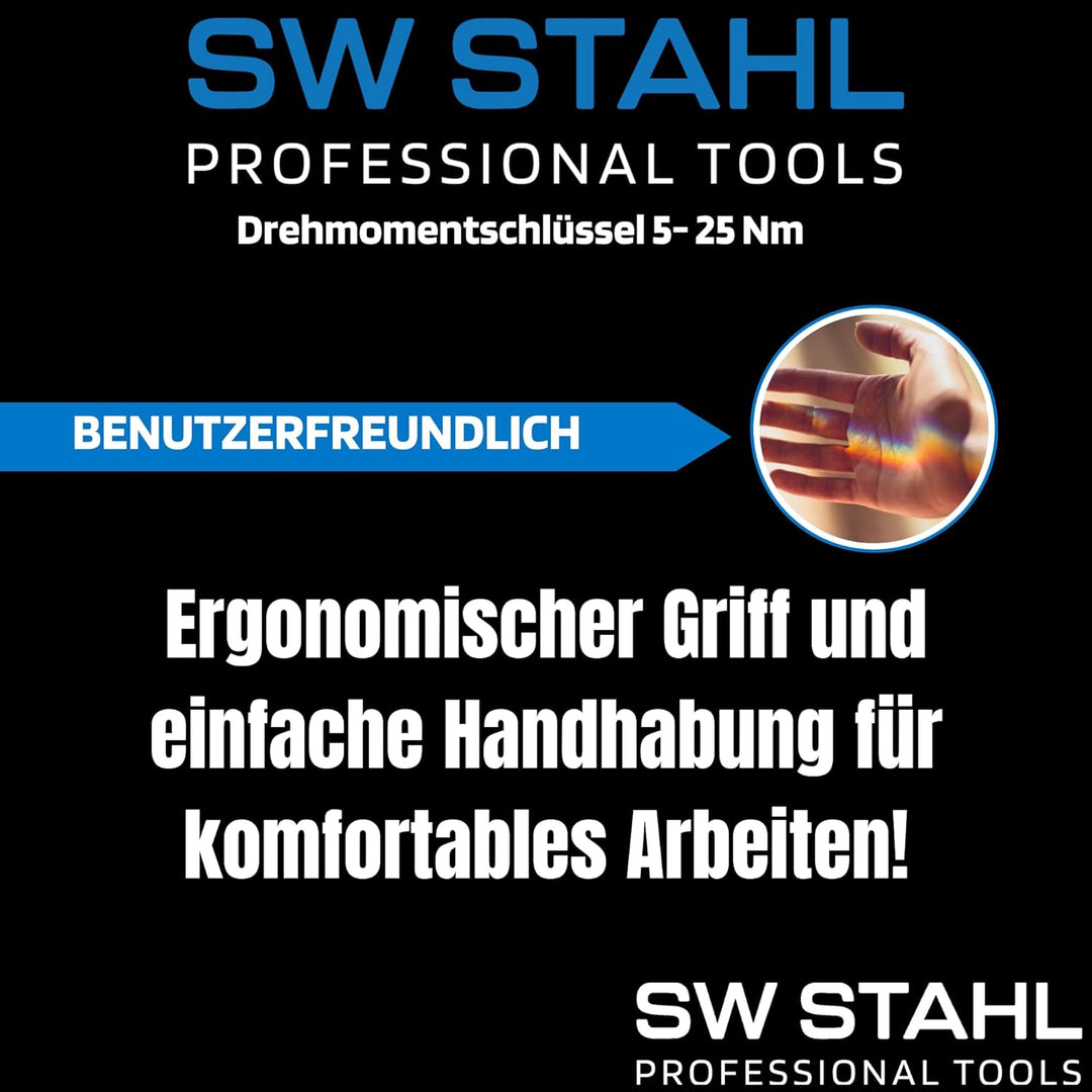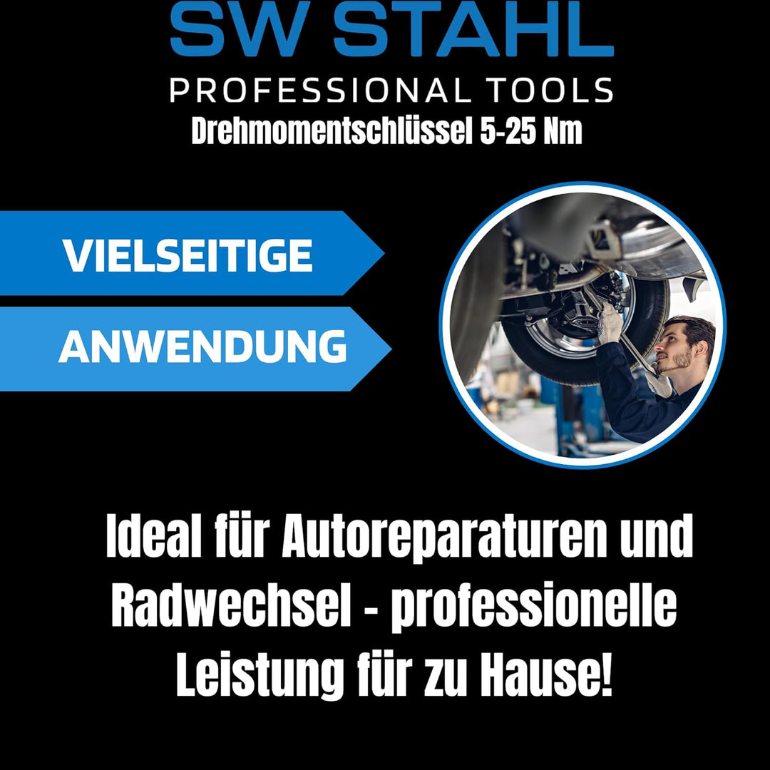 - SW-Stahl 03809L KFZ Drehmomentschlüssel bietet einen einstellbaren Drehmomentbereich von 5-25 Nm und hat eine Auslösegenauigkeit von ± 4% somit deckt der Radschlüssel alle gängigen Anzugsmomente ab.
