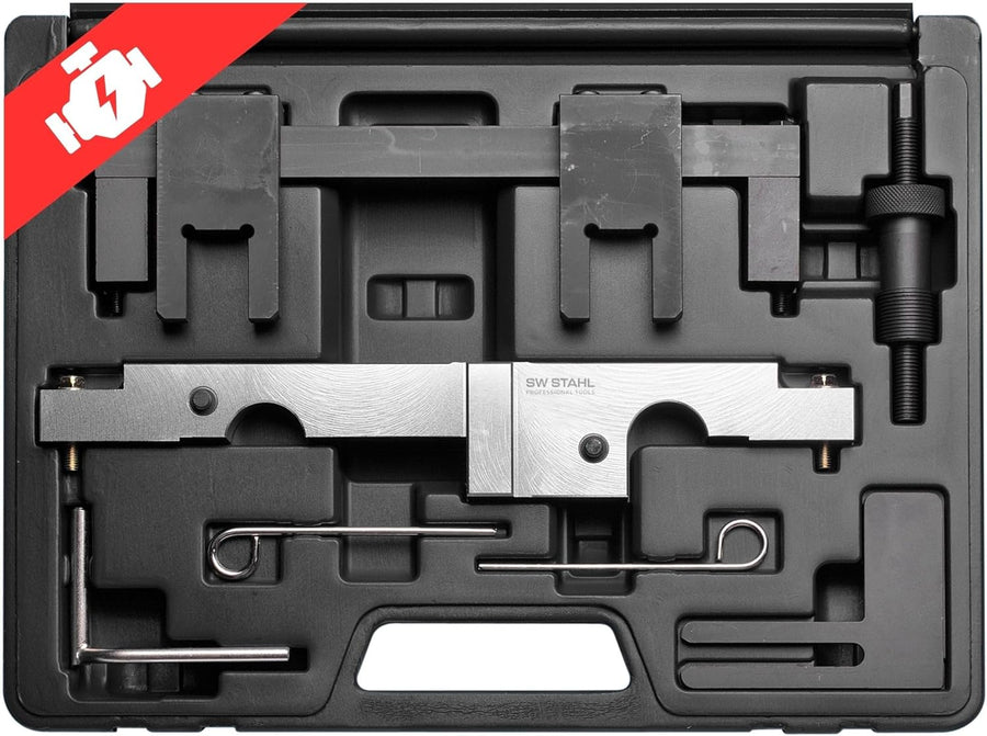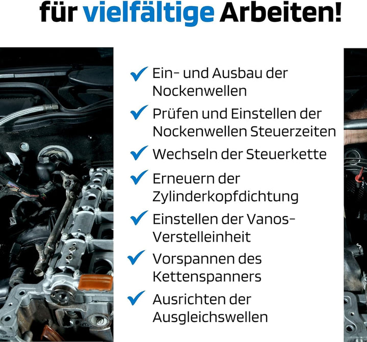 - Dieses Werkzeug Set beinhaltet alle wichtigen Werkzeuge für folgende Arbeiten: Zum Ein- und Ausbau der Nockenwellen, Prüfen und Einstellen der Nockenwellen Steuerzeiten, zum Wechseln der Steuerkette, zum Erneuern der Zylinderkopfdichtung, zum
