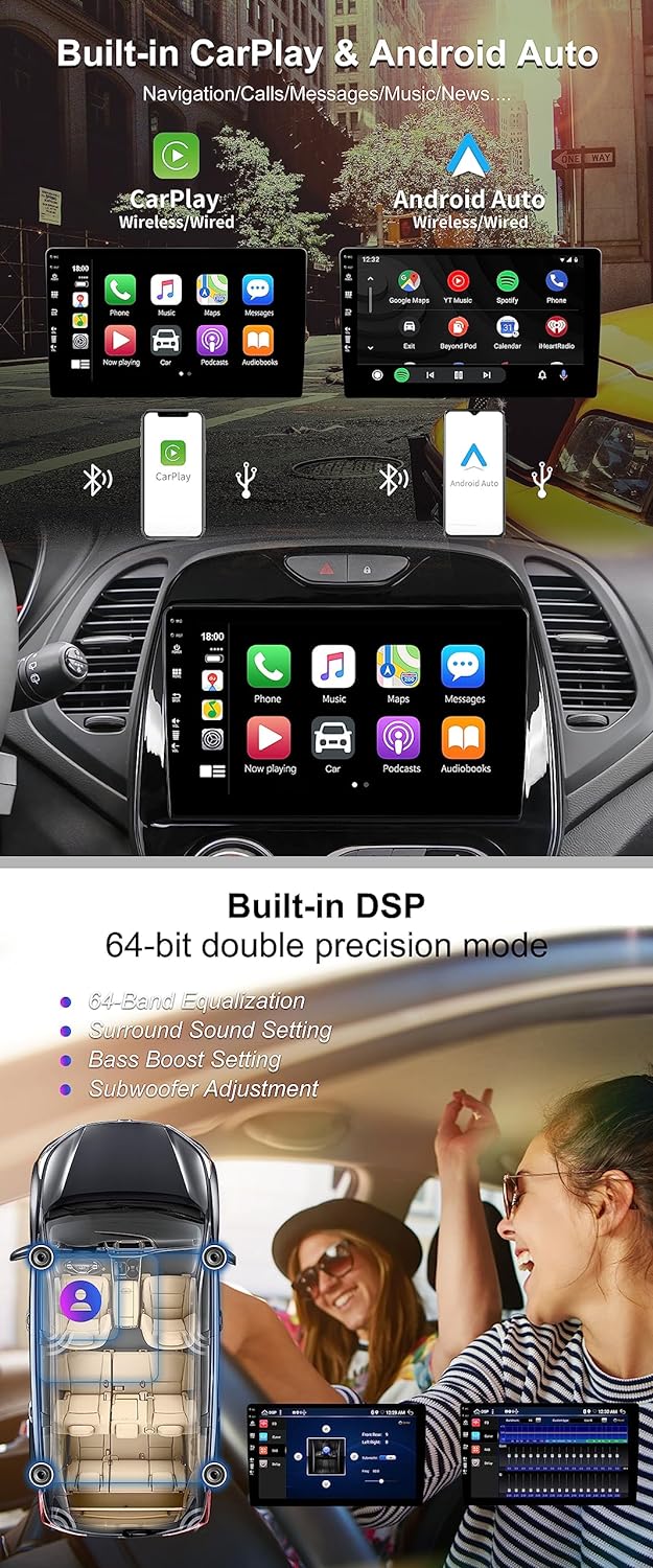 - 【DRAHTLOSES CARPLAY - ANDROID AUTO - DSP】①Integriertes drahtloses Carplay und Android Auto, unterstützt Funktionen Ihres Smartphones für die Verwendung im Auto, z. Sprachsteuerung mit Android Auto, Musikwiedergabe, Navigation, Telefonanrufe und