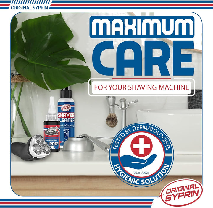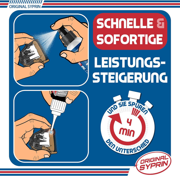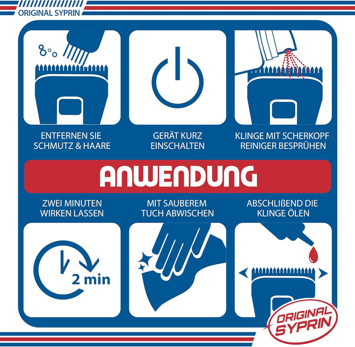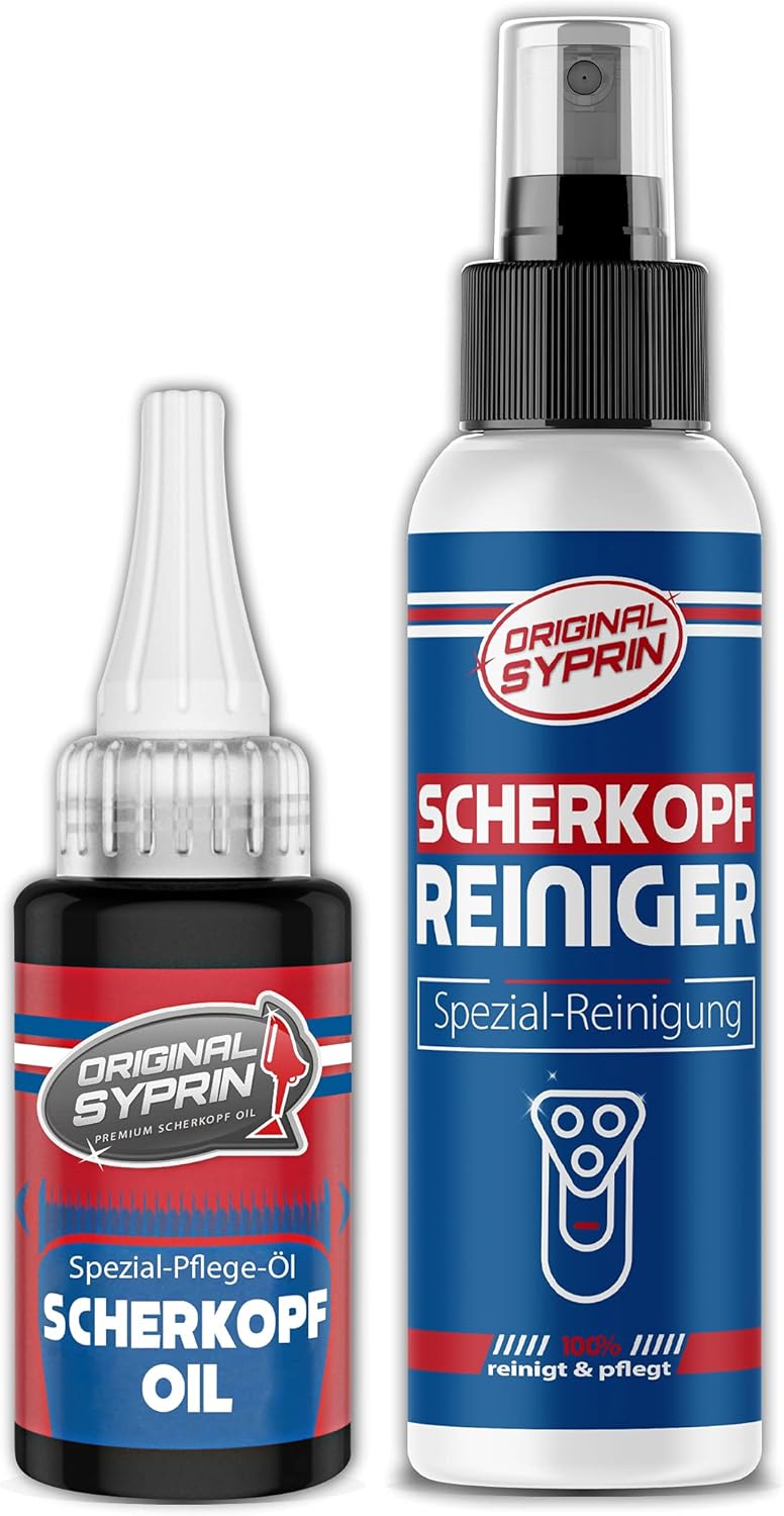 - ✅ ZUVERLÄSSIGKEIT & PFLEGE: Original Syprin Scherkopföl + Scherkopf Reiniger dient zur Pflege Ihrer Elektrorasierer, Schermaschinen und Trimmer, die zuverlässig Talgreste, Haare und Gerüche entfernen.